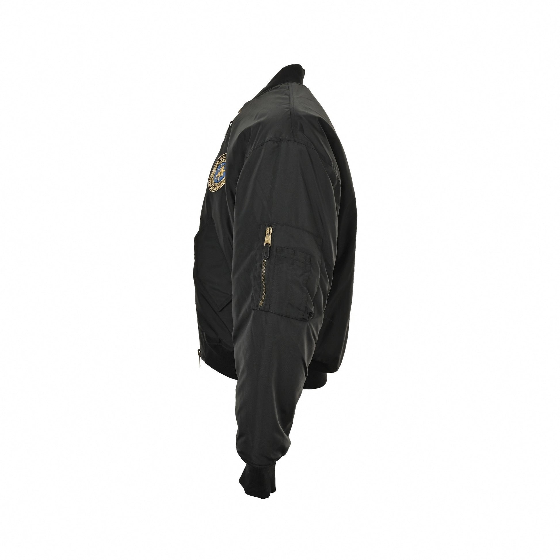 Details: Embroidered crest chest patch, sleeve utility pocket, two-way brass zip