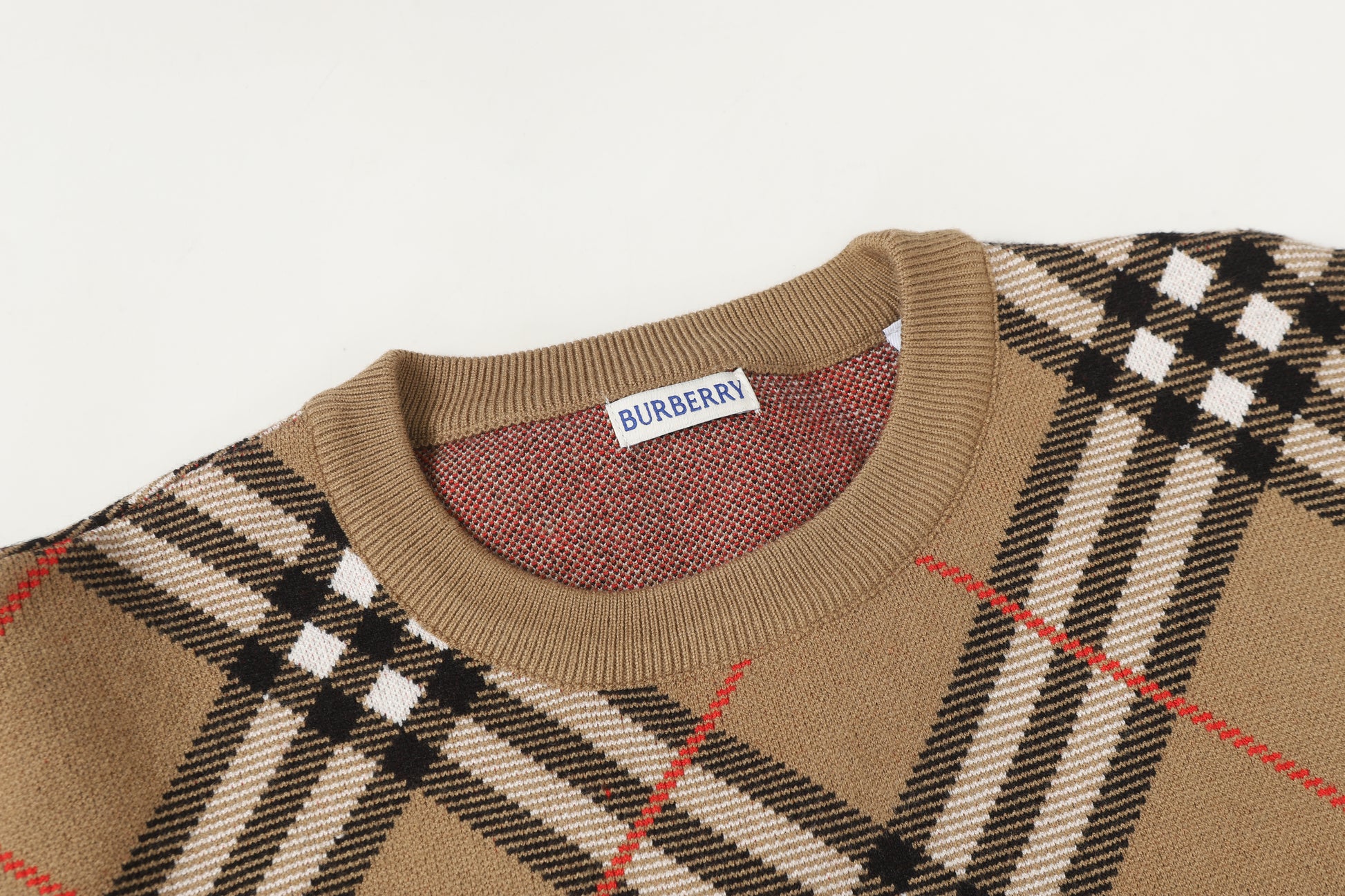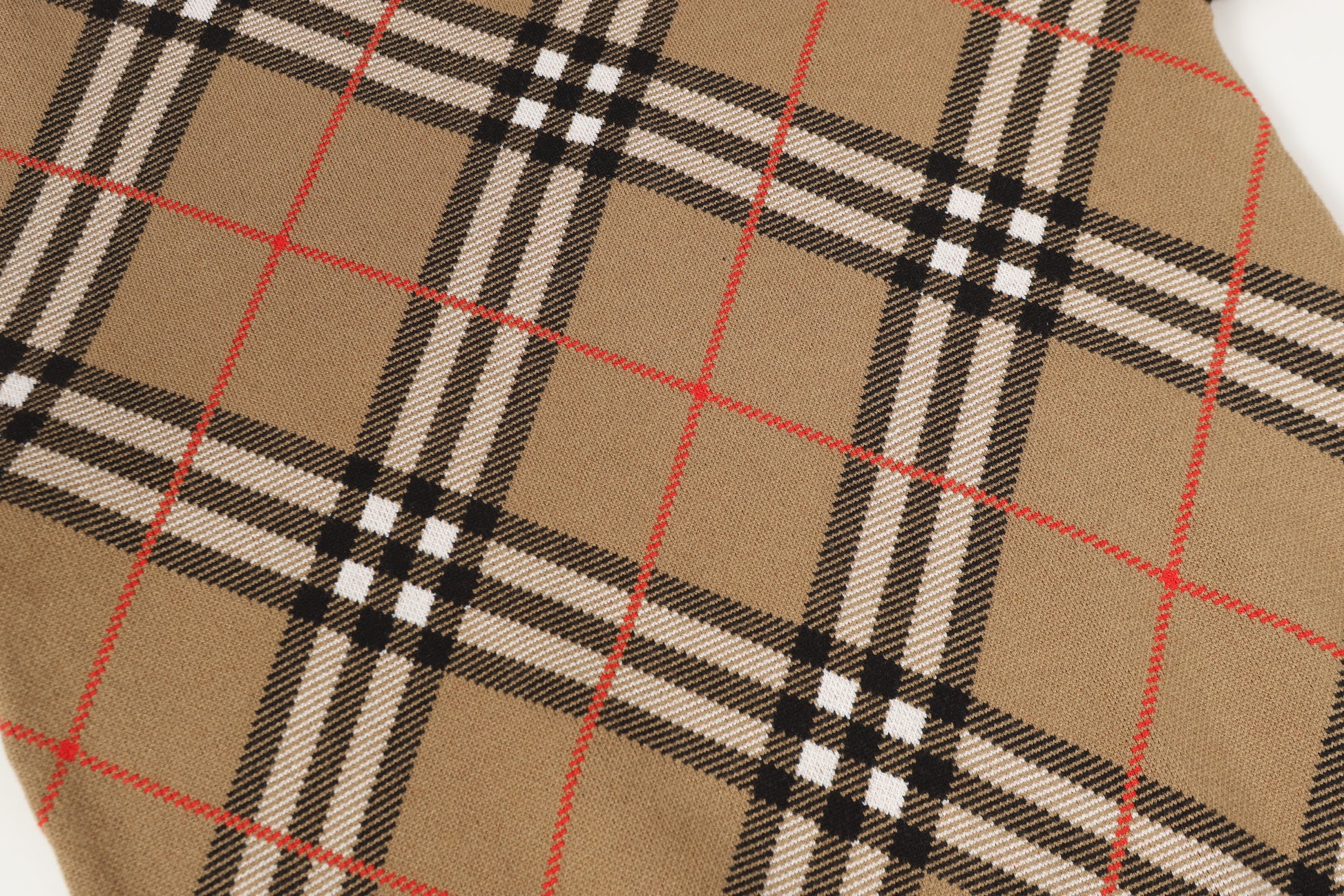 Channel quintessential British luxury with a bold graphic twist. This Burberry crewneck reimagines the house’s legendary vintage check, exploding the pattern into an oversized diagonal diamond motif that merges heritage sophistication with a relaxed, modern silhouette.