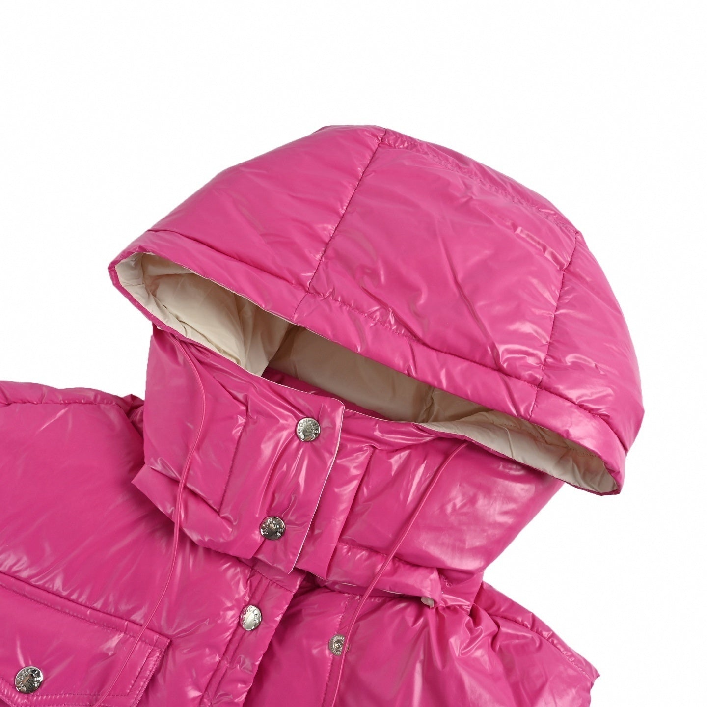 The vest is crafted from a lustrous pink technical fabric with a signature quilted down construction for superior warmth. It features a practical detachable hood with an adjustable drawstring and a high-neck snap-button closure to shield against the elements. The front is accented with a functional snap-button chest pocket and two secure side-zip pockets. Moncler’s iconic felt logo patch sits prominently on the chest, serving as a hallmark of luxury craftsmanship.