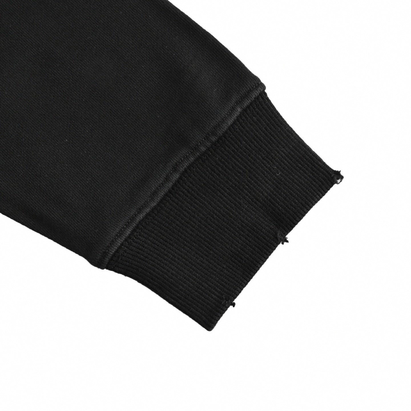 The design is defined by its bold, hand-painted style branding in stark white contrast. The front features a subtle Interlocking G logo on the chest, while the reverse showcases a massive "Gucci" script paired with the iconic GG motif. To complete the edgy look, the garment is finished with intentional distressing and fraying along the ribbed collar, cuffs, and hem.