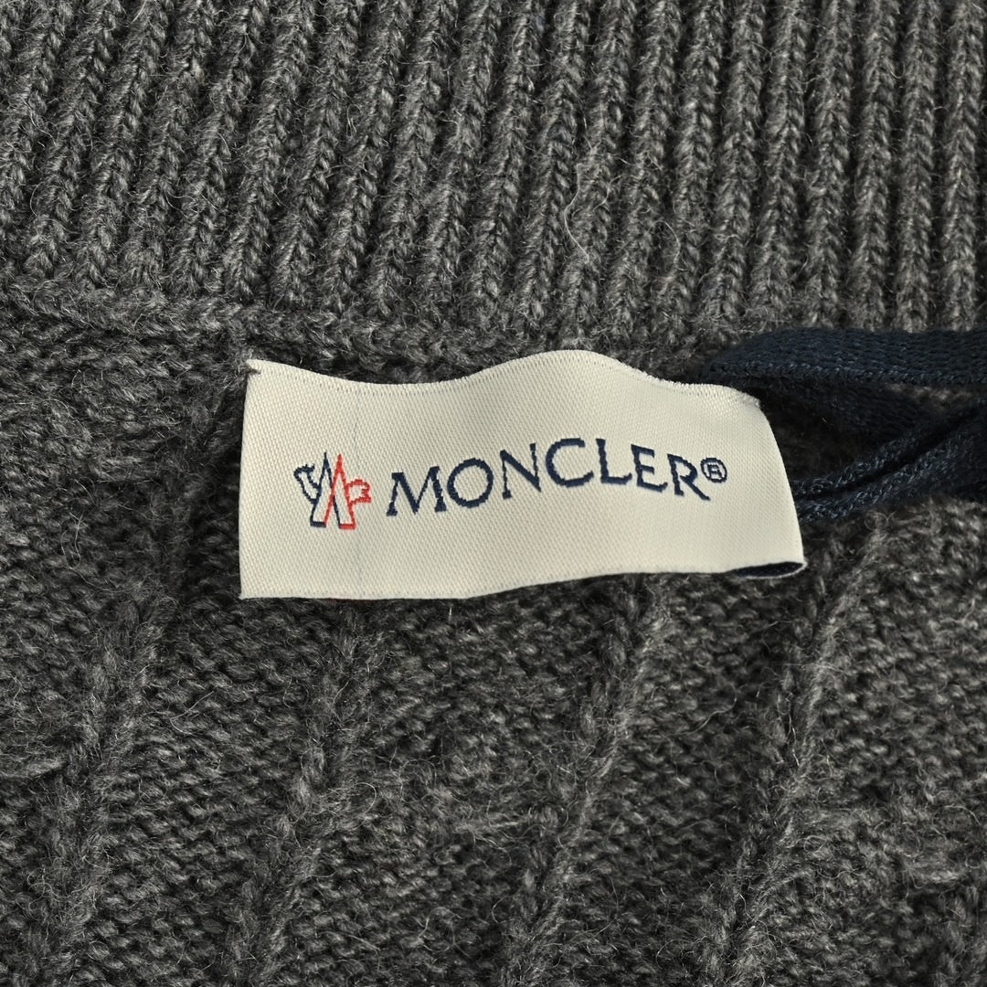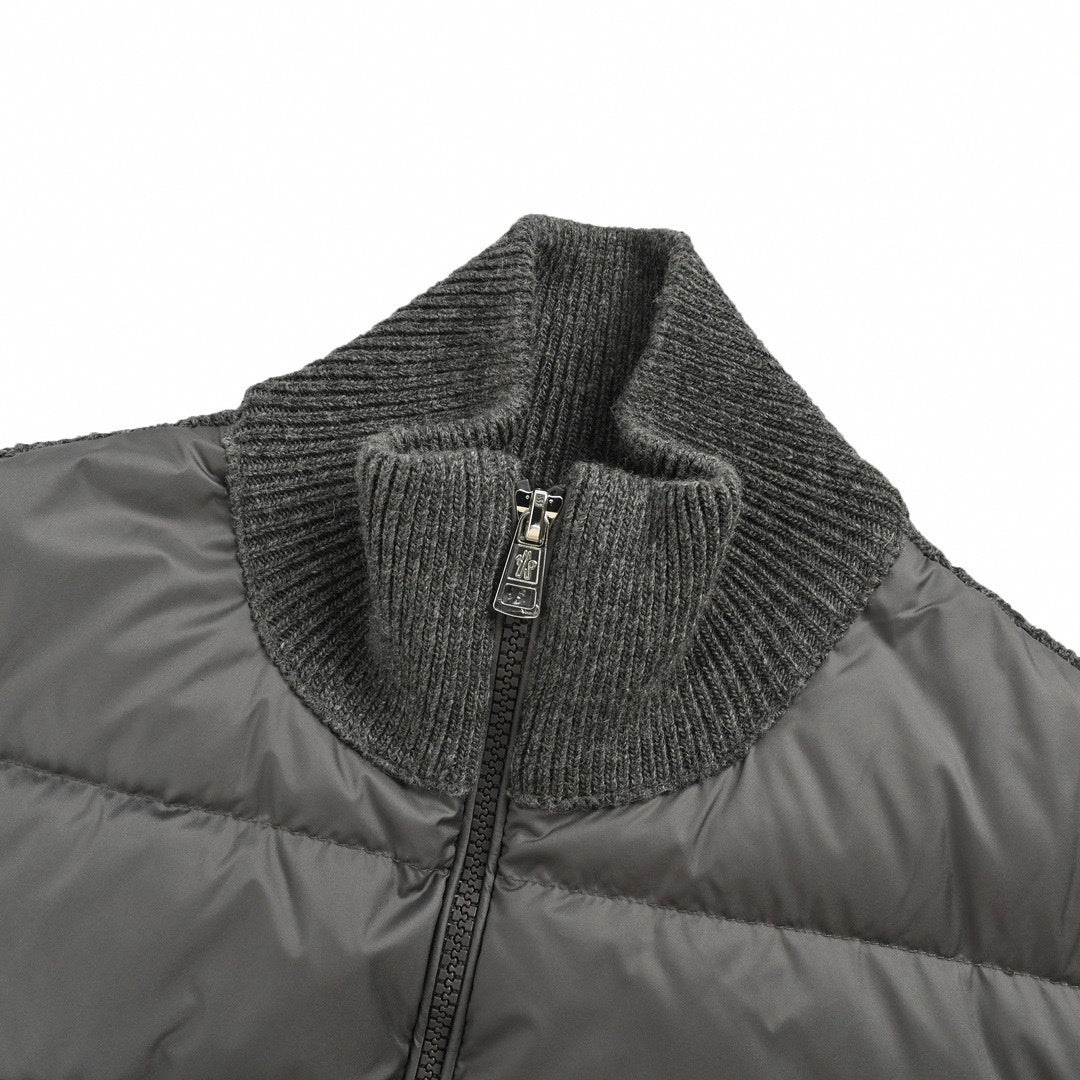 The front panel features a sleek, down-filled nylon shell with horizontal boudin quilting for core warmth. In contrast, the back, sleeves, and stand collar are crafted from a thick, cable-knit grey wool, adding rich texture and flexibility. The design is finished with sporty white double stripes on the left arm that frame the iconic felt logo patch, alongside a two-way zip closure and secure zippered pockets.