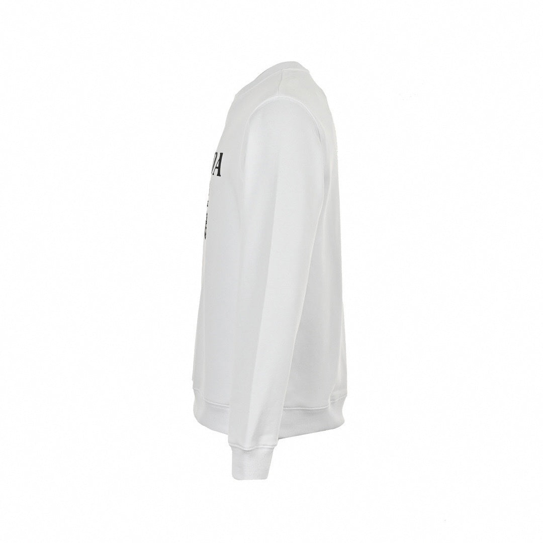 The sweatshirt is presented in a crisp knit, serving as a bright canvas for the bold, contrasting black graphic across the center chest. The artwork features the classic "PRADA MILANO" lettering positioned above a "DAL 1913" ribbon and the brand's signature royal crest, nodding to its rich Italian heritage. Designed with traditional sportswear cues, the garment includes a classic ribbed crew neckline featuring a vintage-inspired V-stitch insert, along with structured ribbed cuffs and hem for a comfortable fit.