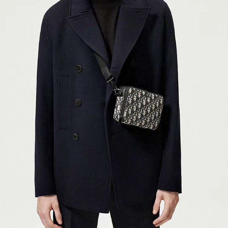 This zip-up clutch, crafted in Italy or Spain, pays homage to the 1969 Dior Oblique pattern in beige and black jacquard. It features a two-way zip closure, ample interior space with a slip pocket, and three card slots. The clutch comes with an adjustable, detachable Christian Dior nylon jacquard strap adorned with ruthenium-finished brass hooks, offering modern style and effortless elegance for securely storing essentials.