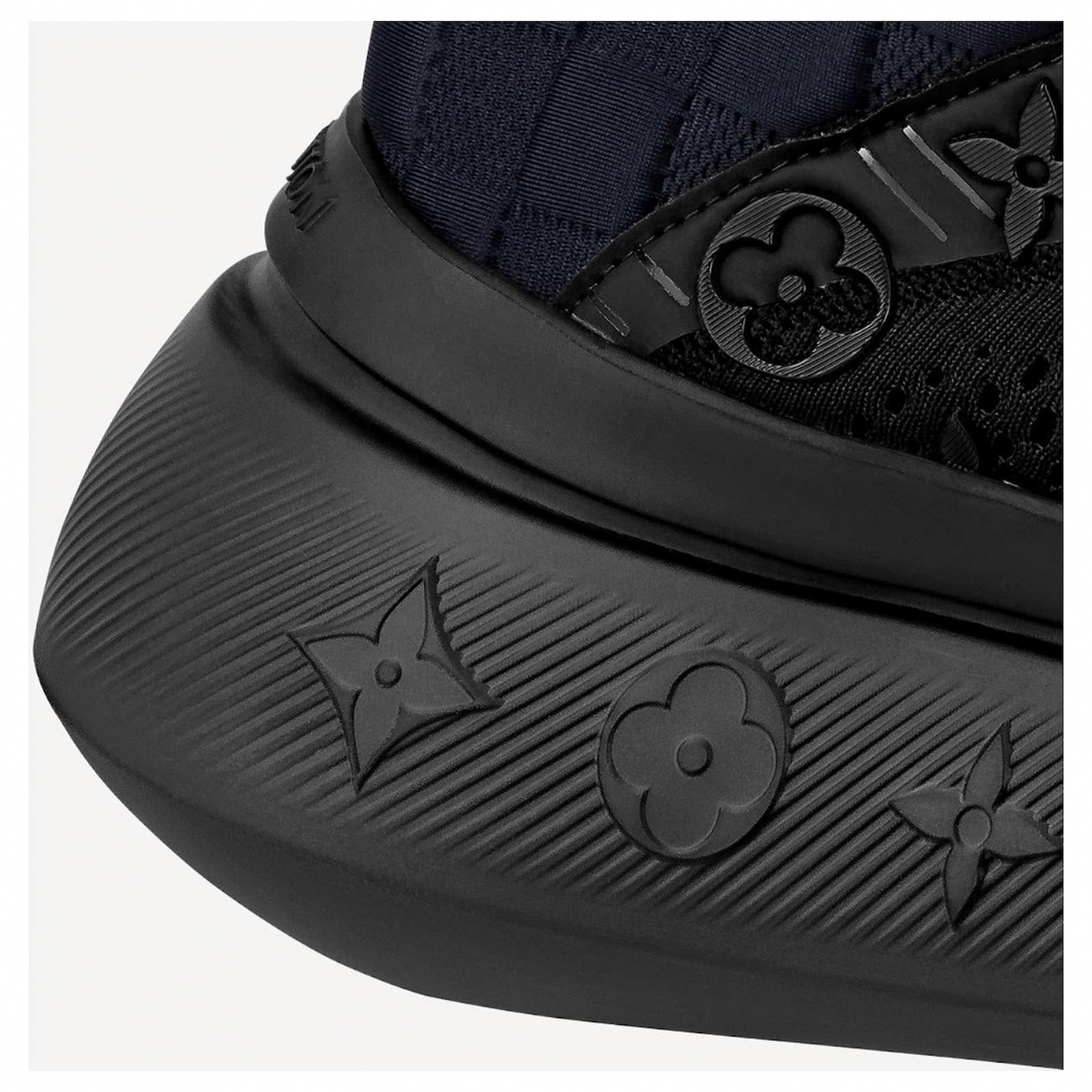The sneakers are expertly crafted from a flexible, breathable black technical knit mesh, providing optimal comfort and a modern, sporty look. The upper is enveloped by a supportive, cage-like overlay that is intricately embossed with the house's iconic Monogram motifs and "LV" initials, serving as a distinct, textural hallmark of luxury. The branding is further emphasized by a bold "LV" logo prominent on the tongue, while a dark, padded collar ensures enhanced structure and ankle support. Designed for a bold stance, the pair is set on a prominent, sculpted chunky rubber sole that is detailed with debossed Monogram flowers for a cohesive, 360-degree finish.