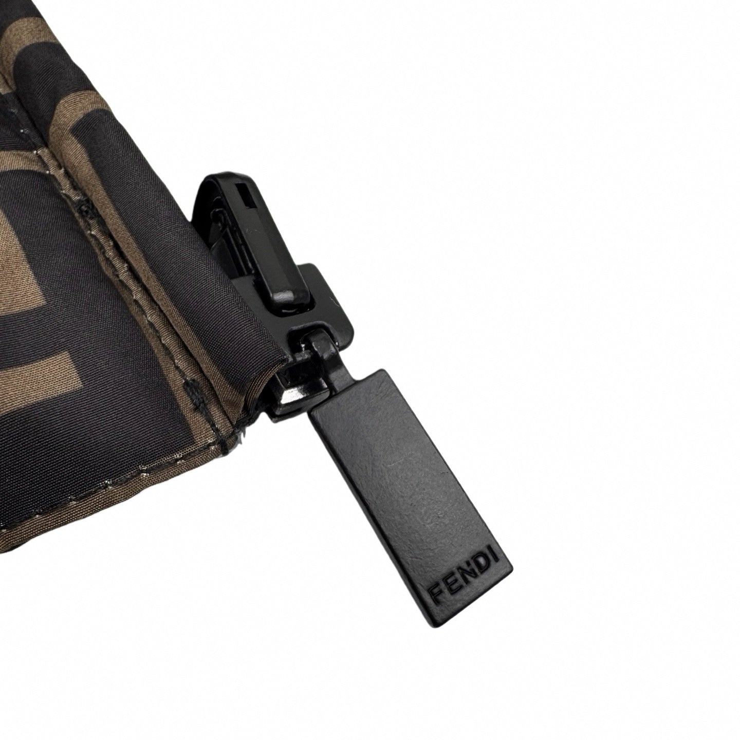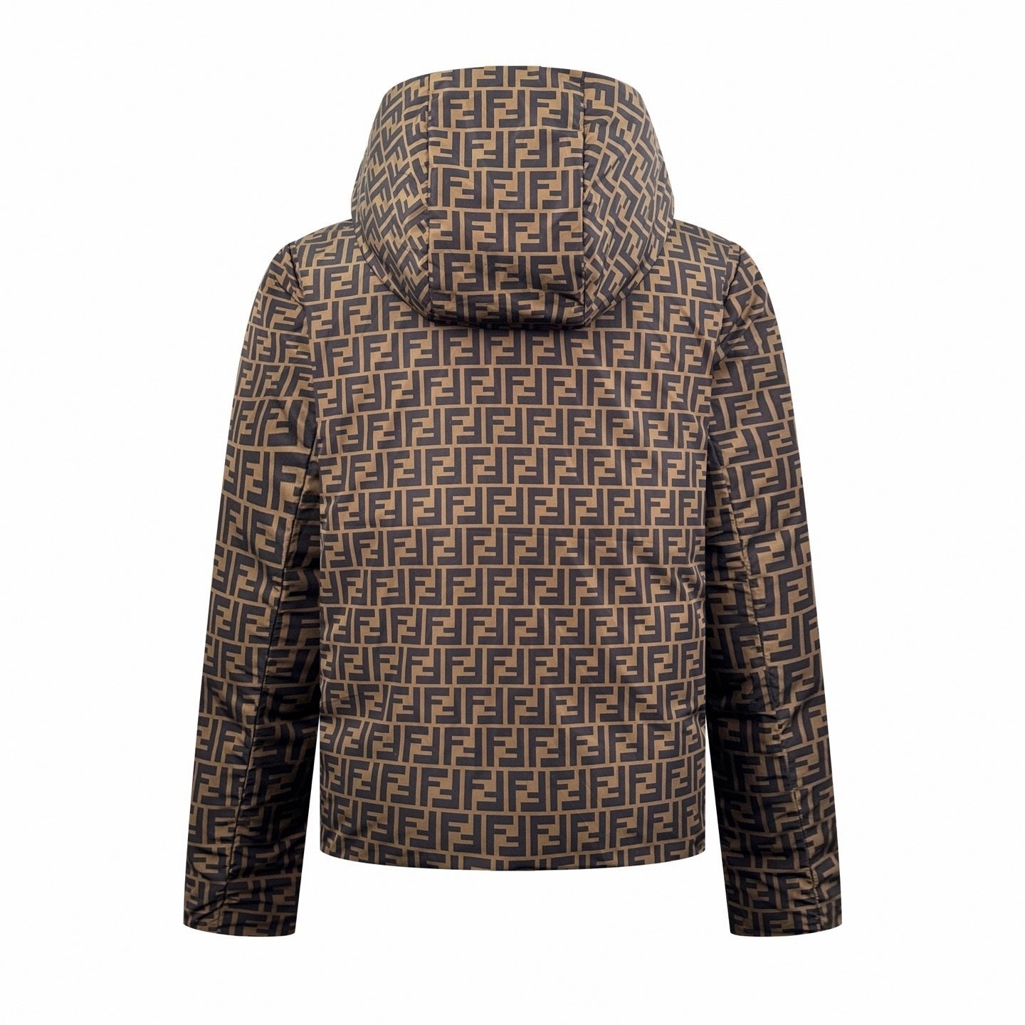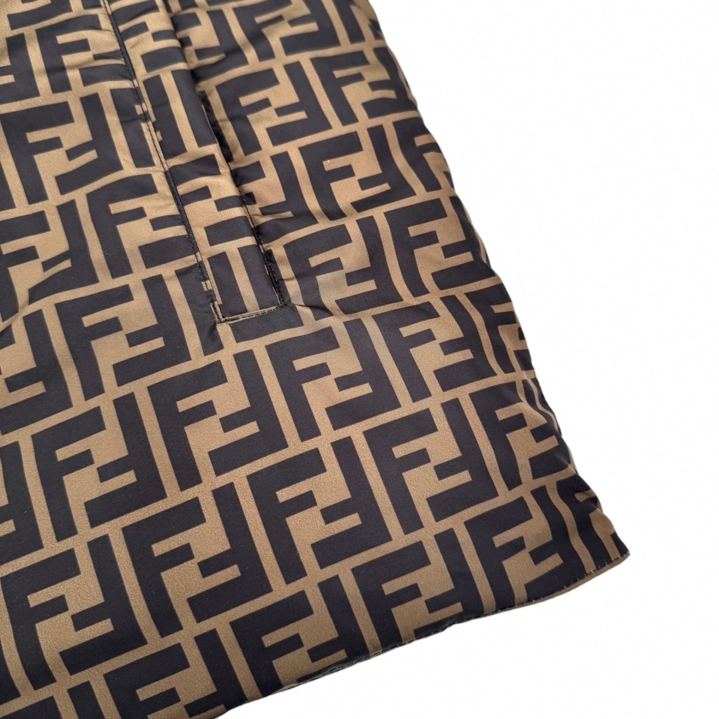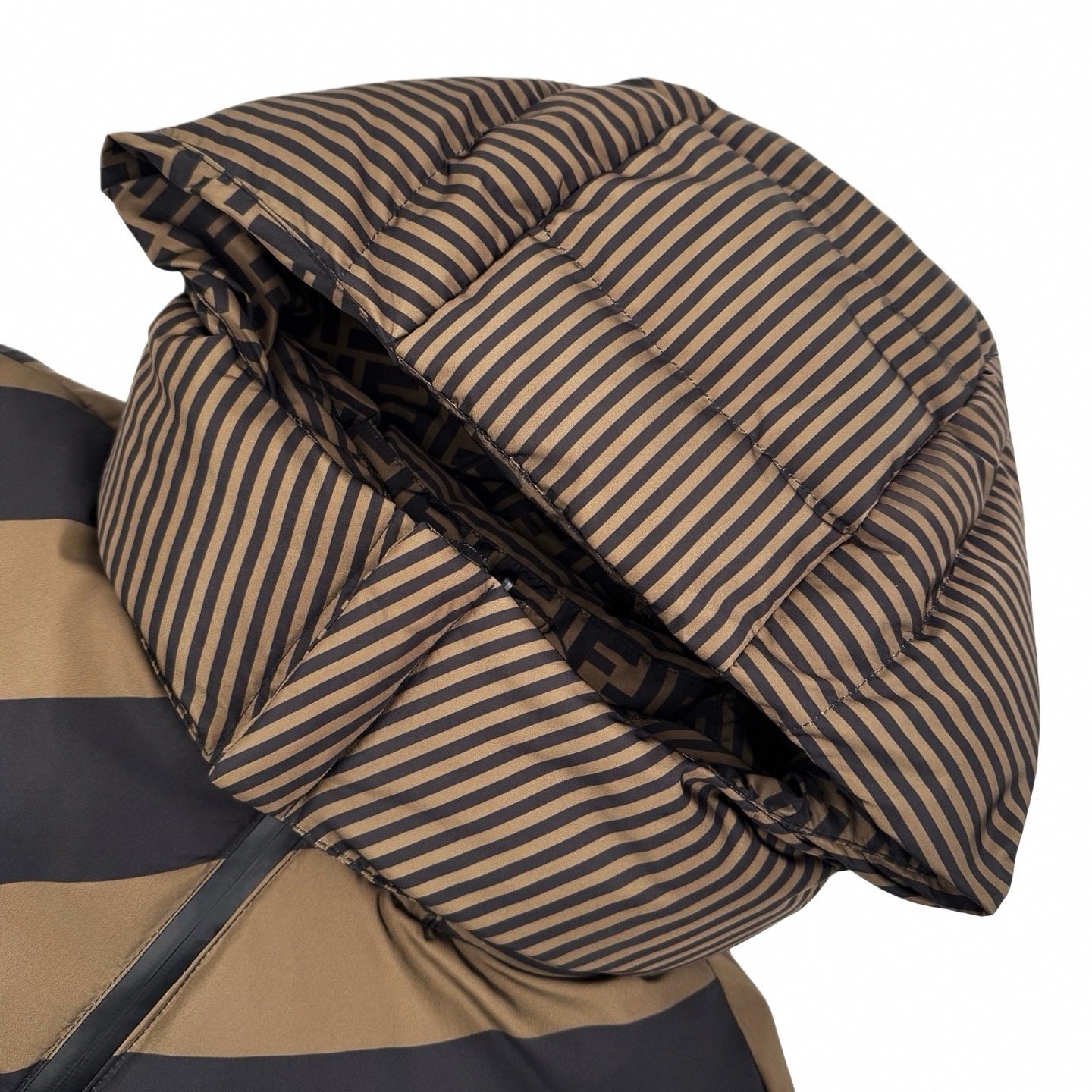 One side showcases the house's iconic all-over FF monogram in signature tobacco and black, delivering unmistakable brand heritage. Flip it inside out to reveal a bold, graphic alternative featuring wide diagonal block stripes that nod to the Maison’s Pequin codes. Finished with a protective hood that highlights the contrasting interior pattern and a central zip closure, it guarantees warmth with maximum visual impact.