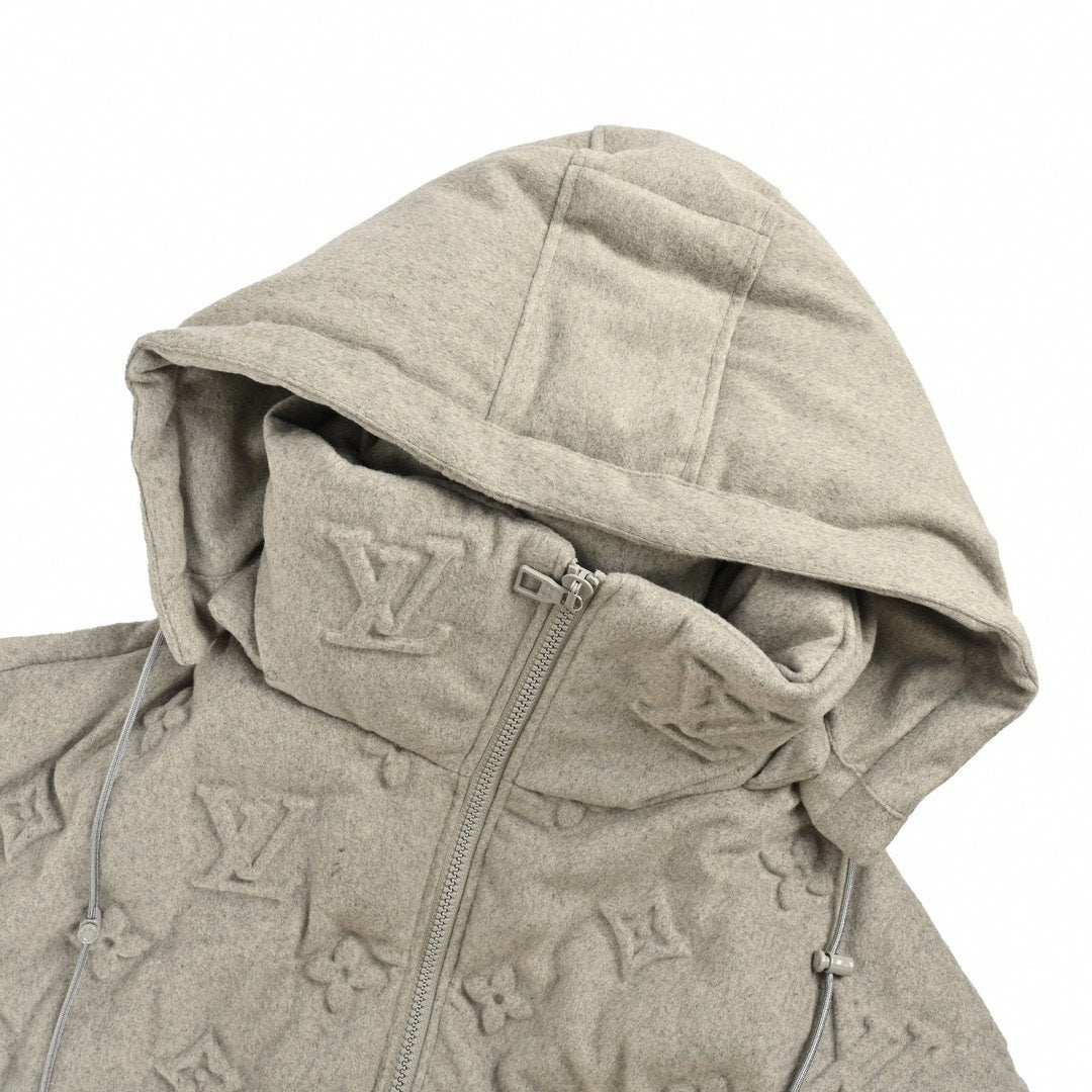 Crafted from a wool blend with a distinctive brushed felt finish, this puffer delivers insane warmth and texture. The all-over Monogram pattern is deeply embossed into the fabric, creating a sculptural, 3D visual effect that subtly pops against the tonal grey surface. Detailed with a high protective funnel neck, a cozy hood with drawstrings, and a full-zip closure, this is a sophisticated heavy-hitter perfect for winter styling.