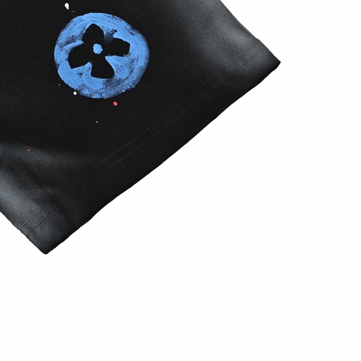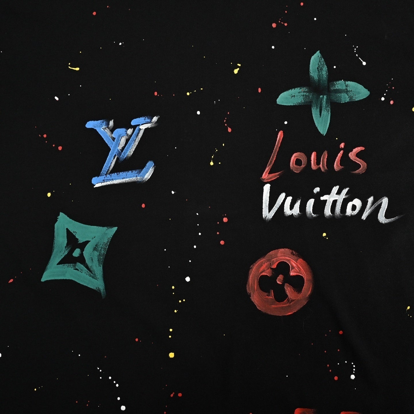 Crafted from premium soft cotton jersey, this piece delivers a comfortable, breathable fit perfect for making a statement. The design is defined by scattered, spray-paint effect Monogram flowers and LV initials in bold colors, alongside a script "Louis Vuitton" logo on the chest that pops against the black base. Finished with subtle paint splatter details and a signature orange branded label on the back neck, this is a collectible heavy-hitter for your daily rotation.