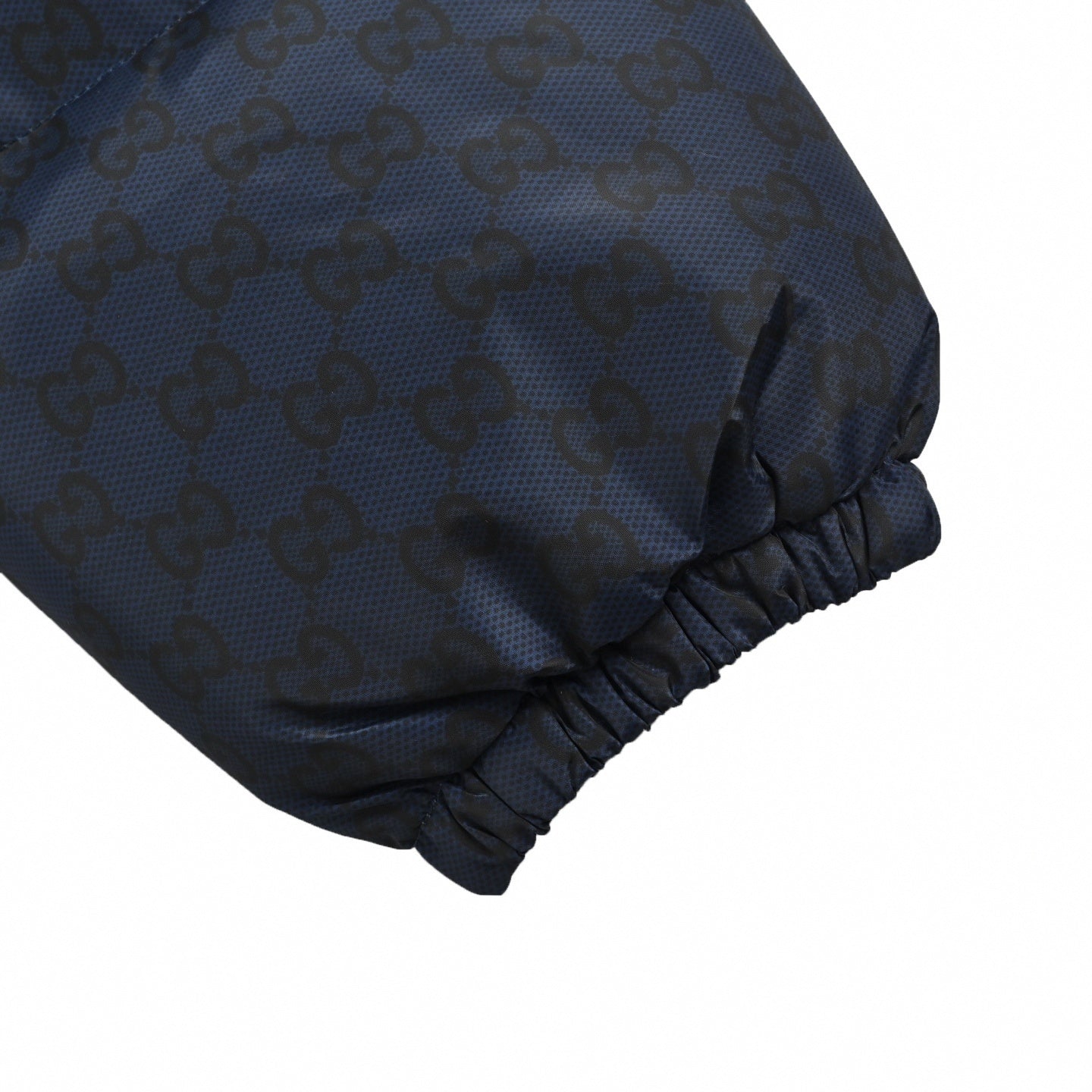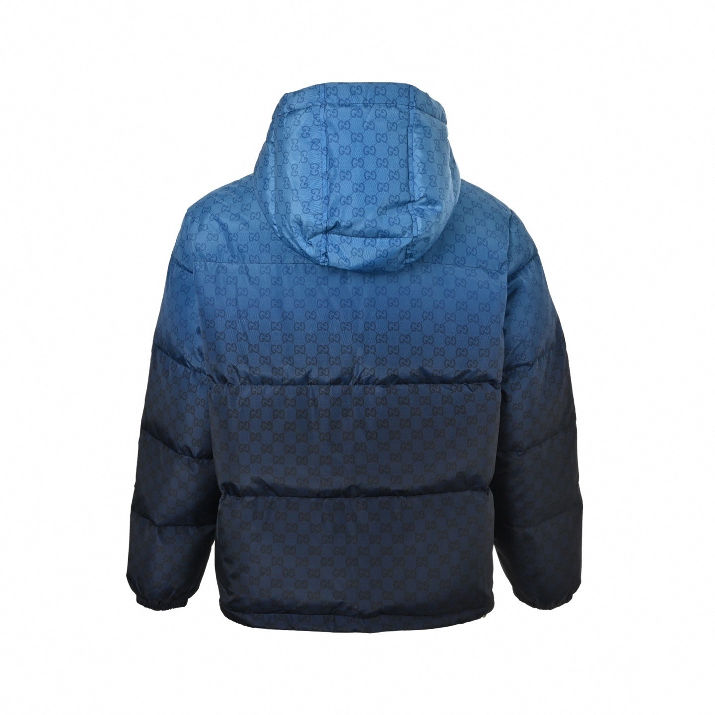 The silhouette is defined by a stunning ombré gradient that transitions seamlessly from a vibrant, electric blue at the hood and shoulders down to a deep midnight navy at the hem. The iconic GG monogram is woven directly into the nylon fabric in a tonal jacquard, creating a textured, light-catching effect that is unmistakably Gucci without being overpowering. Equipped with a generous hood and premium insulation, it’s a heavy-hitter for cold weather that doesn't compromise on drip.