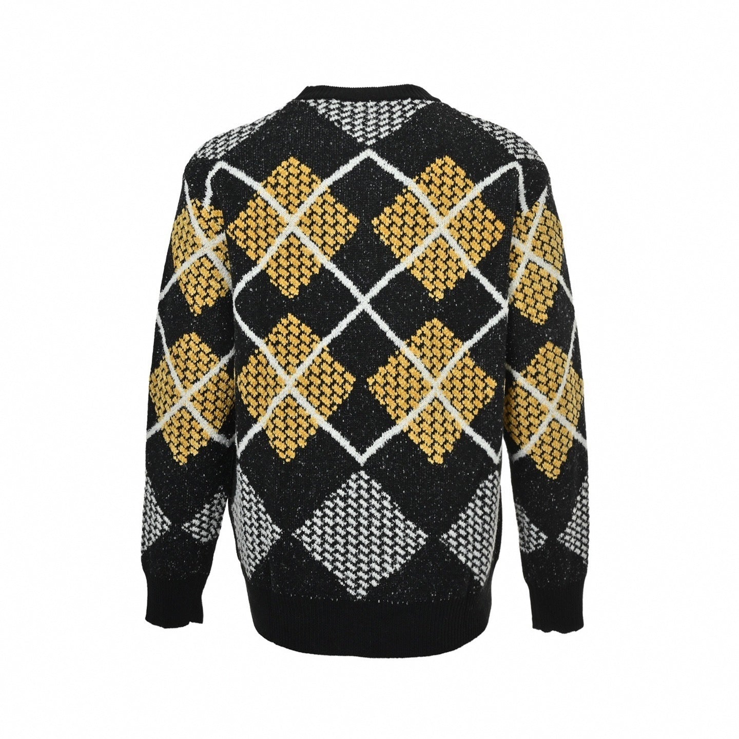 Command attention with this graphic Louis Vuitton knit, a piece that masterfully blends archival branding with bold, modern texture. This crewneck reimagines the classic argyle sweater, featuring oversized diamonds outlined in white and filled with a rich, tactile yellow and white popcorn knit against a black background.
