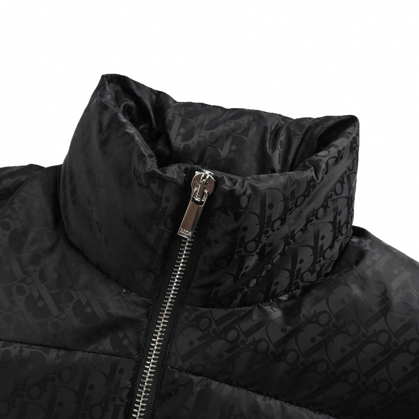 Crafted from technical jacquard fabric in a sleek, tonal black, the jacket features an all-over Dior Oblique motif that catches the light with a subtle, textured sheen. It’s built for serious warmth with a substantial down fill and a high stand collar to lock out the elements. The look is secured with a robust two-way zip closure, making it a versatile and essential piece for any cold-weather fit.