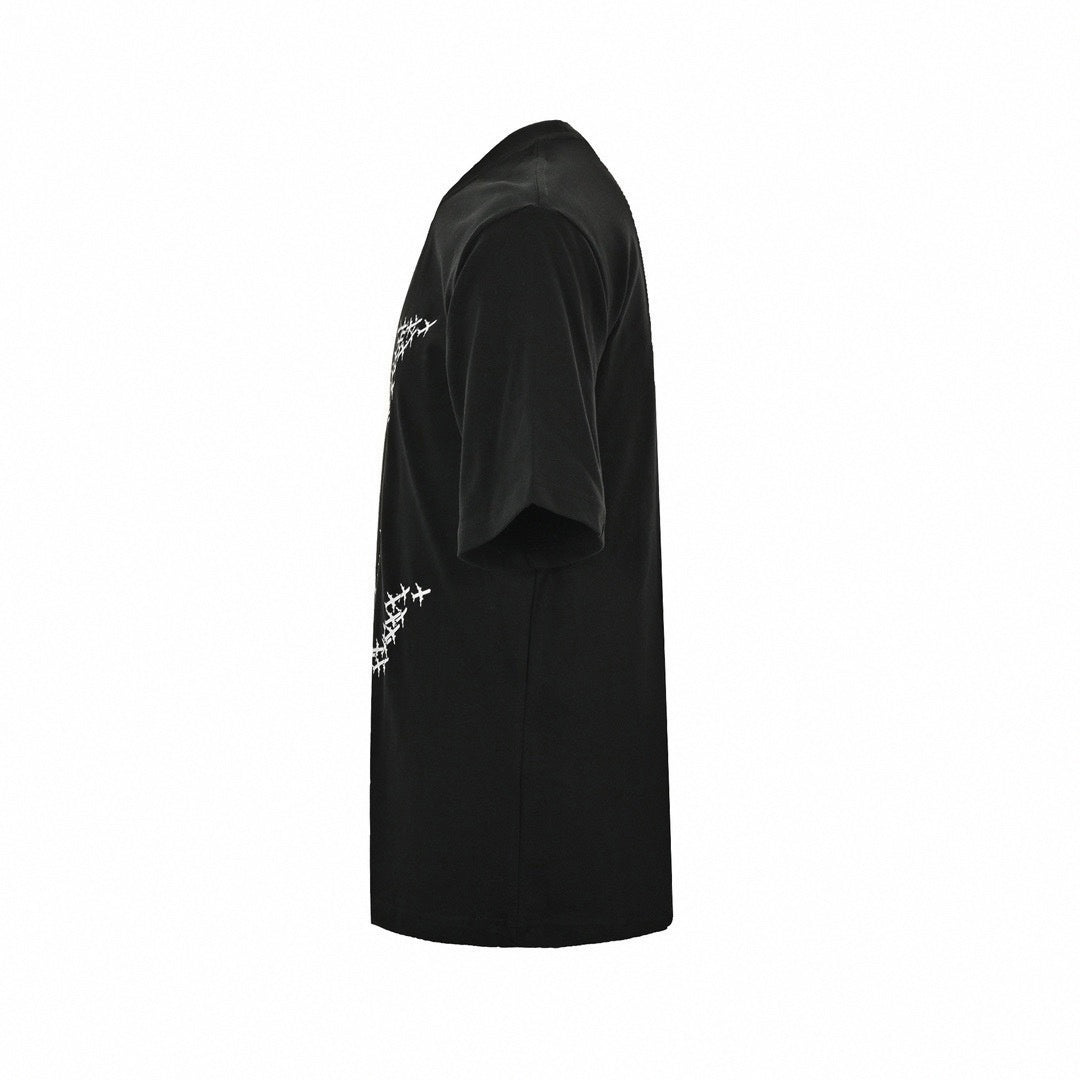 The t-shirt is styled with a classic crew neckline, short sleeves, and a comfortable, relaxed drape. The absolute focal point of the design is the massive 'LV' monogram stationed across the front chest. Upon closer inspection, this oversized logo is cleverly constructed entirely out of tiny airplane silhouettes. Adding a dynamic sense of motion, a flock of these miniature airplanes appears to break away from the main logo, scattering across the right side of the chest and wrapping seamlessly onto the right sleeve. The back of the shirt is clean, save for a distinct, dark rectangular patch stitched directly below the collar, providing a subtle touch of structured branding.