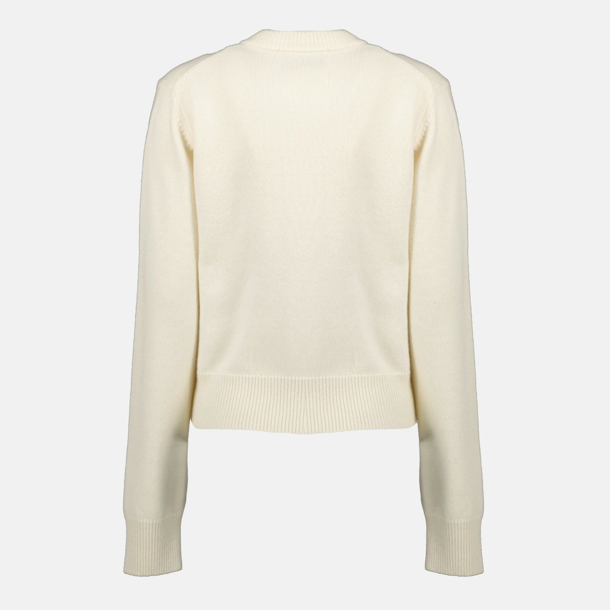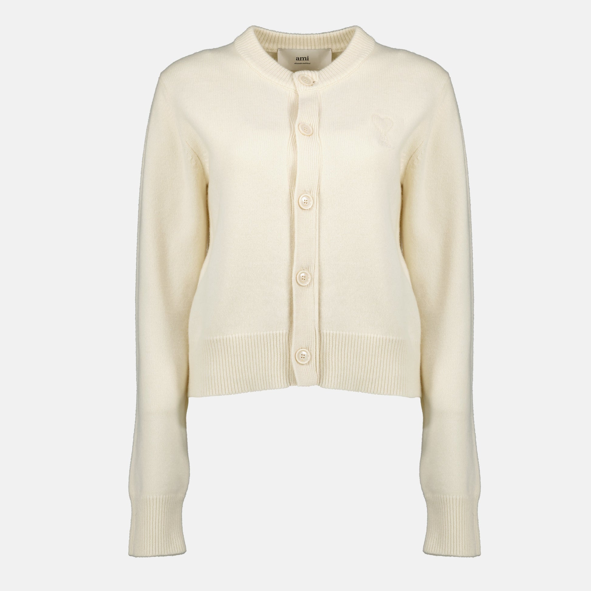 The white AMI Heart cardigan from the brand AMI Paris is crafted from wool and cashmere. It is part of the Autumn-Winter 2025 collection for women.