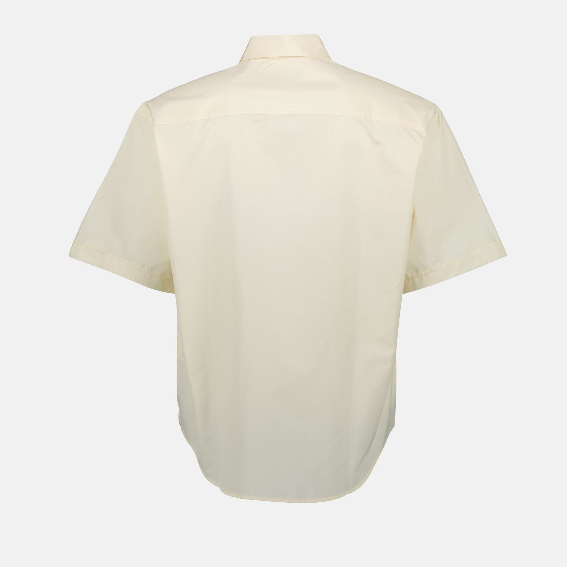 Beige cotton shirt from the brand AMI Paris for men, Spring-Summer 2025 collection. It features a pointed collar, short sleeves, and an embroidered Ami de cœur logo.