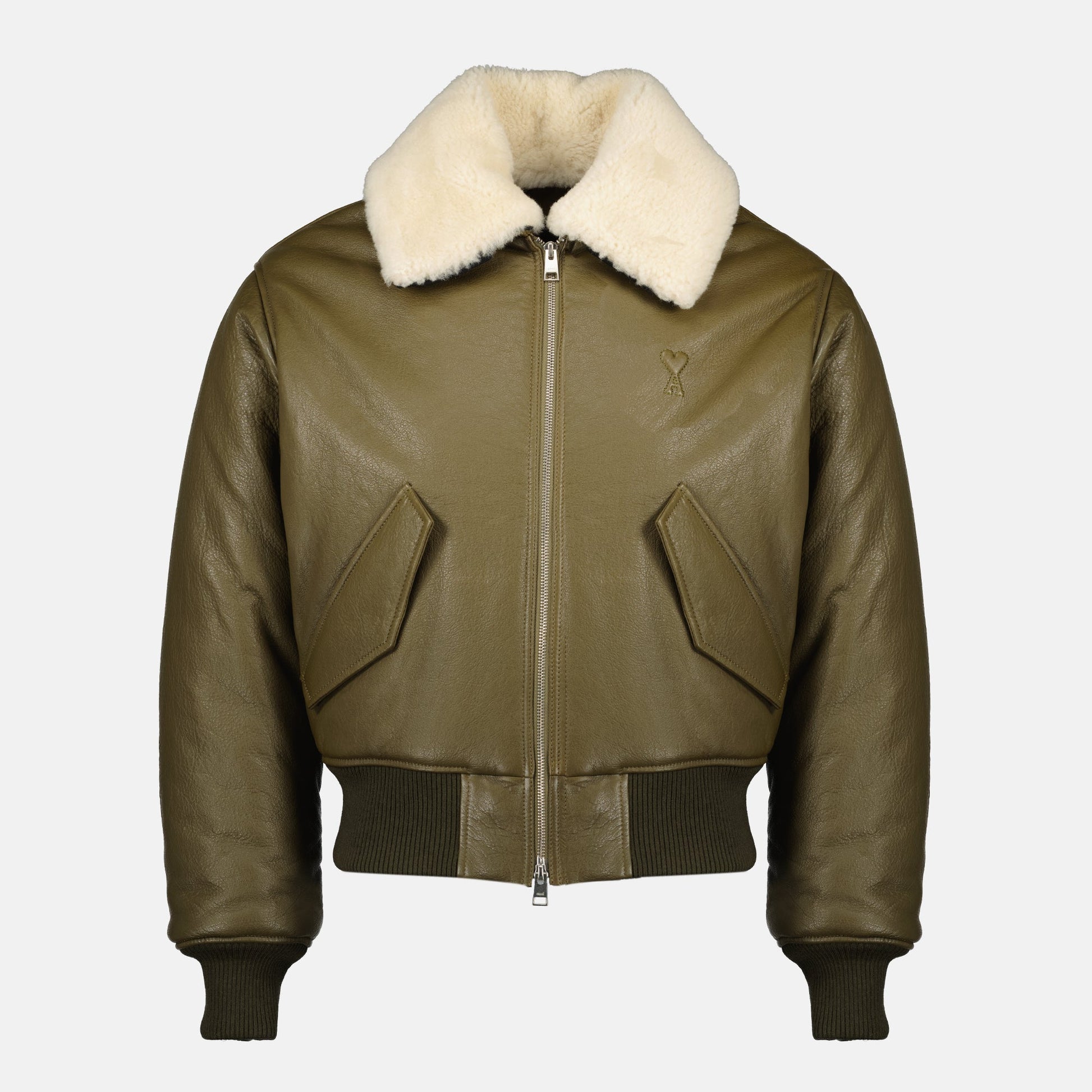 The khaki leather jacket from AMI PARIS is a men's model from the Autumn-Winter 2025 collection. It features a high collar, long sleeves, and an embroidered logo on the chest.