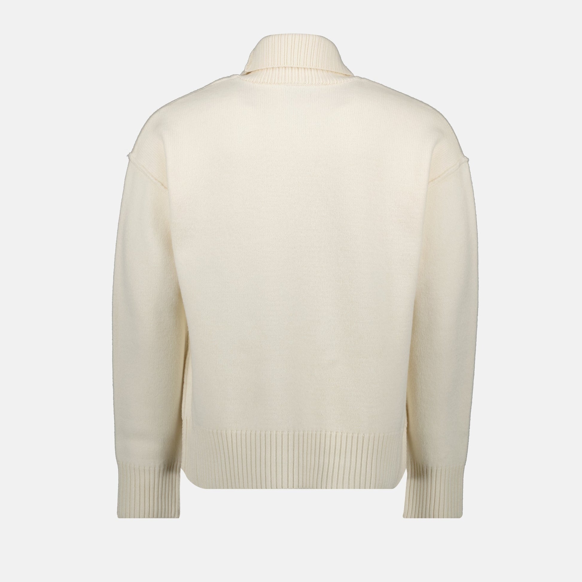 The beige Ami de Coeur sweater from the Ami Paris brand is a unisex model made of wool, featuring a turtleneck and long sleeves. It is part of the Autumn-Winter 2025 collection.