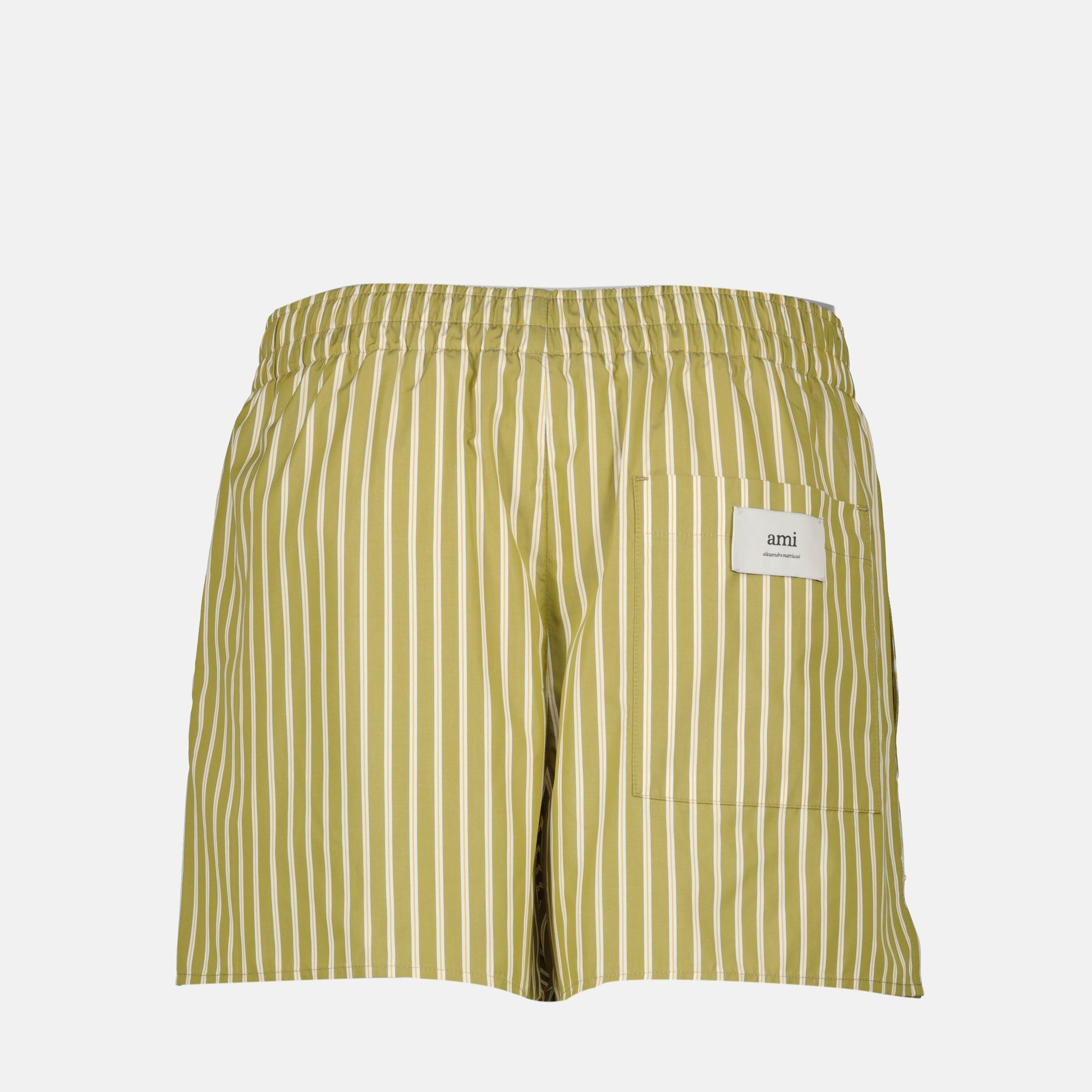 Khaki striped shorts from the brand Ami Paris, this unisex model is made from cotton. It is part of the Spring-Summer 2025 collection and features an elastic waistband and practical pockets.