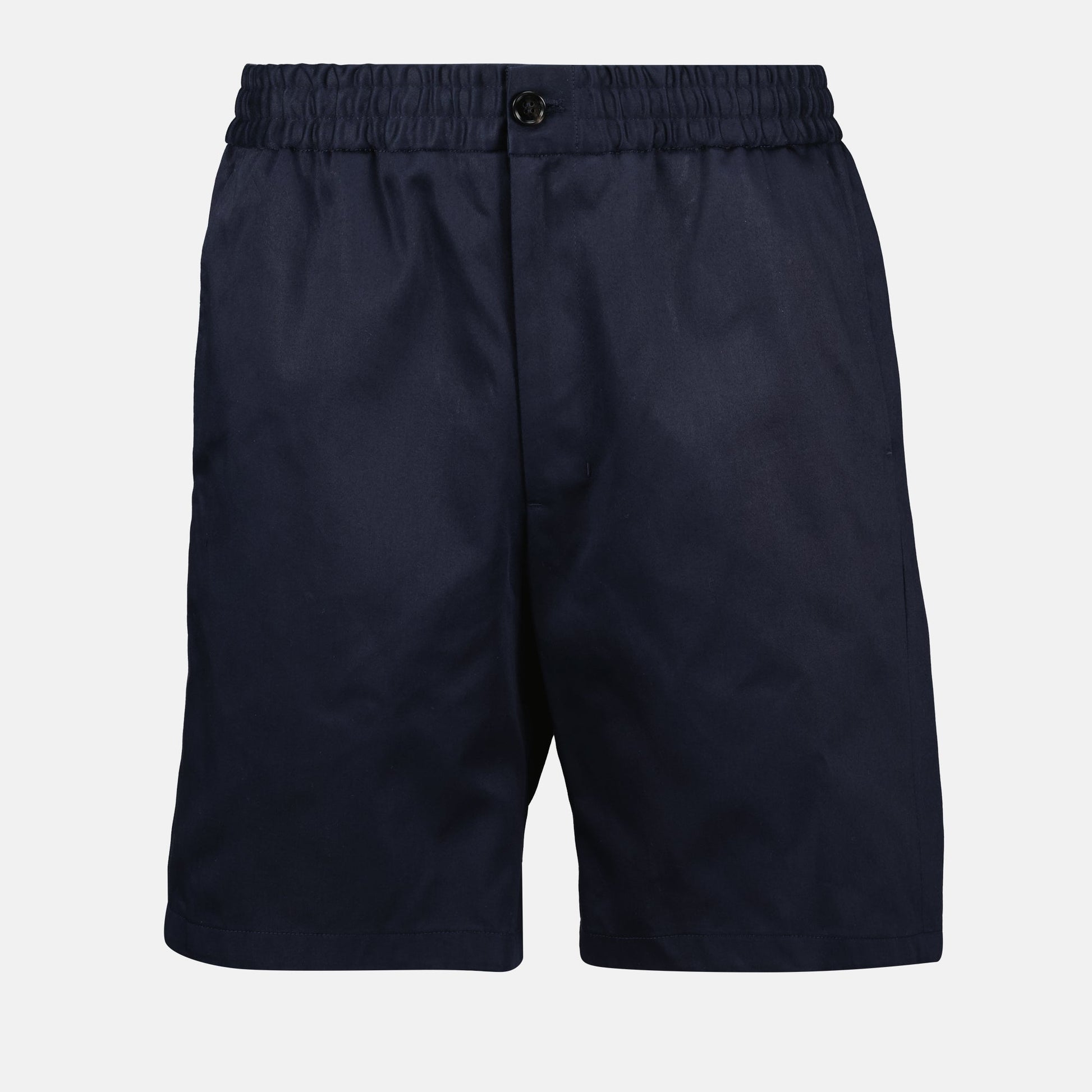 Navy blue cotton shorts from the brand AMI Paris for men, part of the Spring-Summer 2025 collection. They feature a straight fit with an elastic waistband and drawstring.