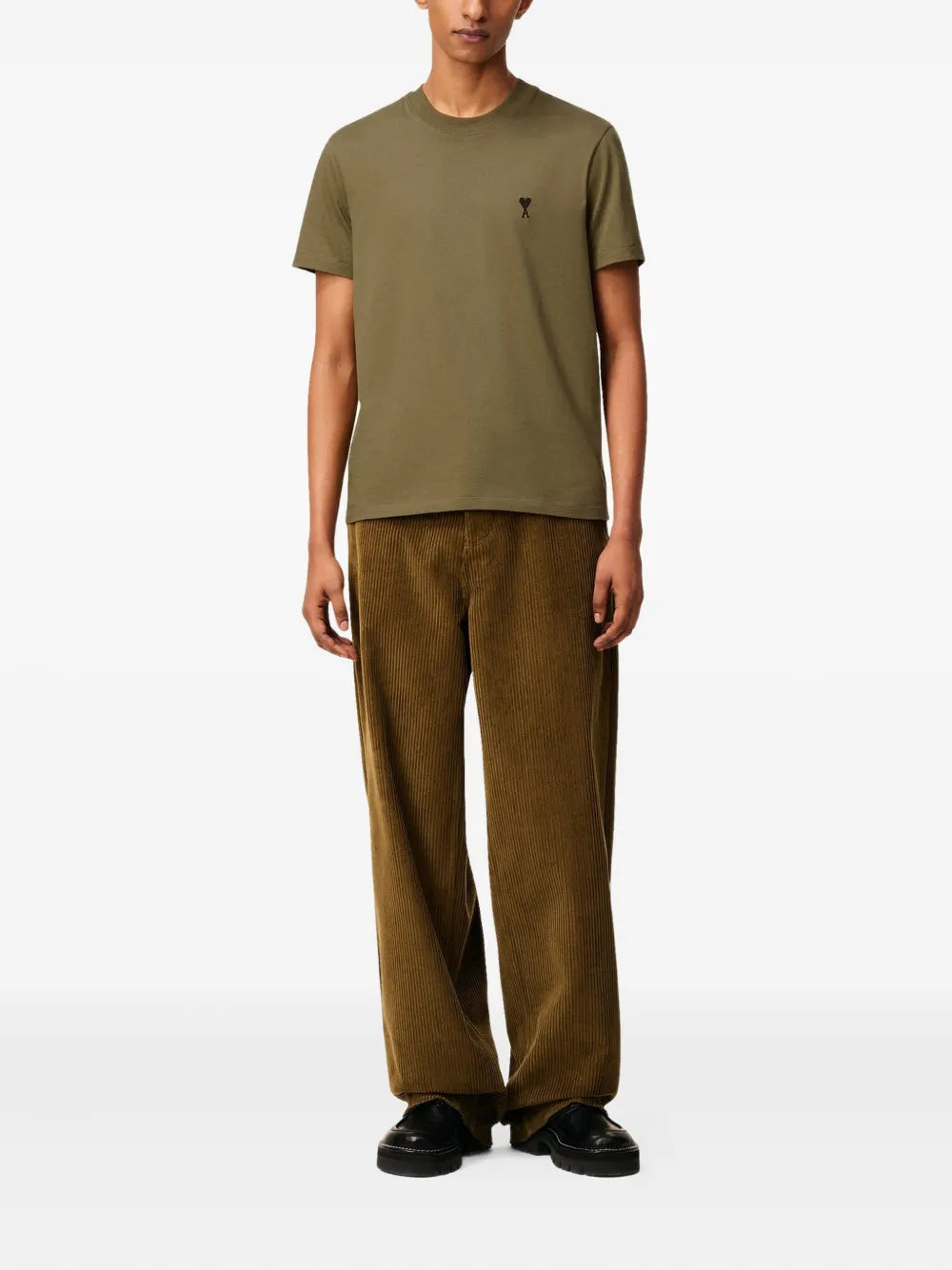 The khaki Ami de coeur T-shirt from the brand Ami Paris is a men's garment. It is part of the Autumn-Winter 2025 collection and is made of cotton.