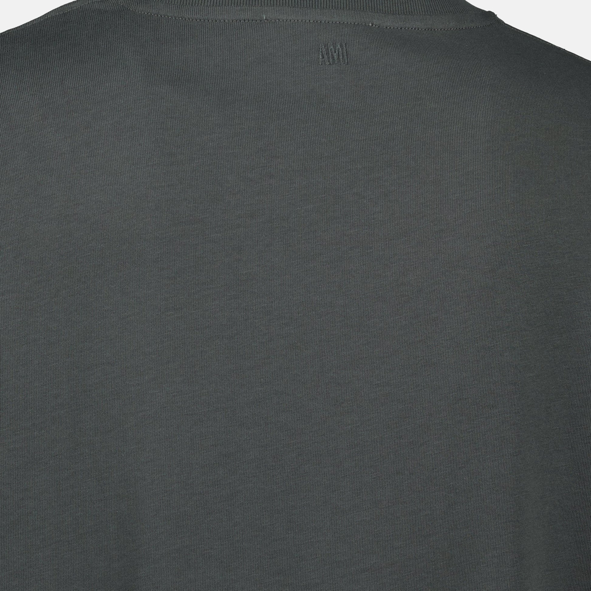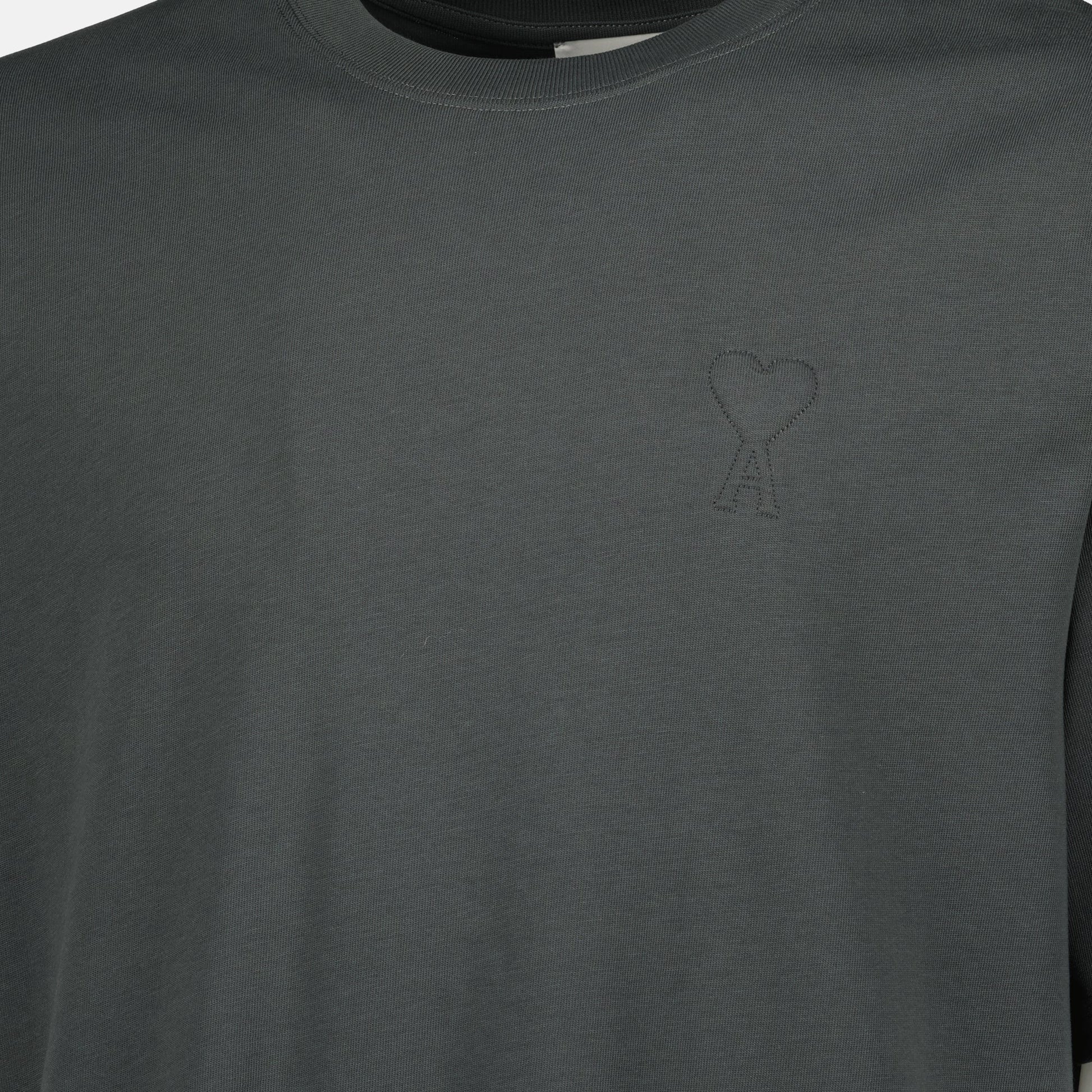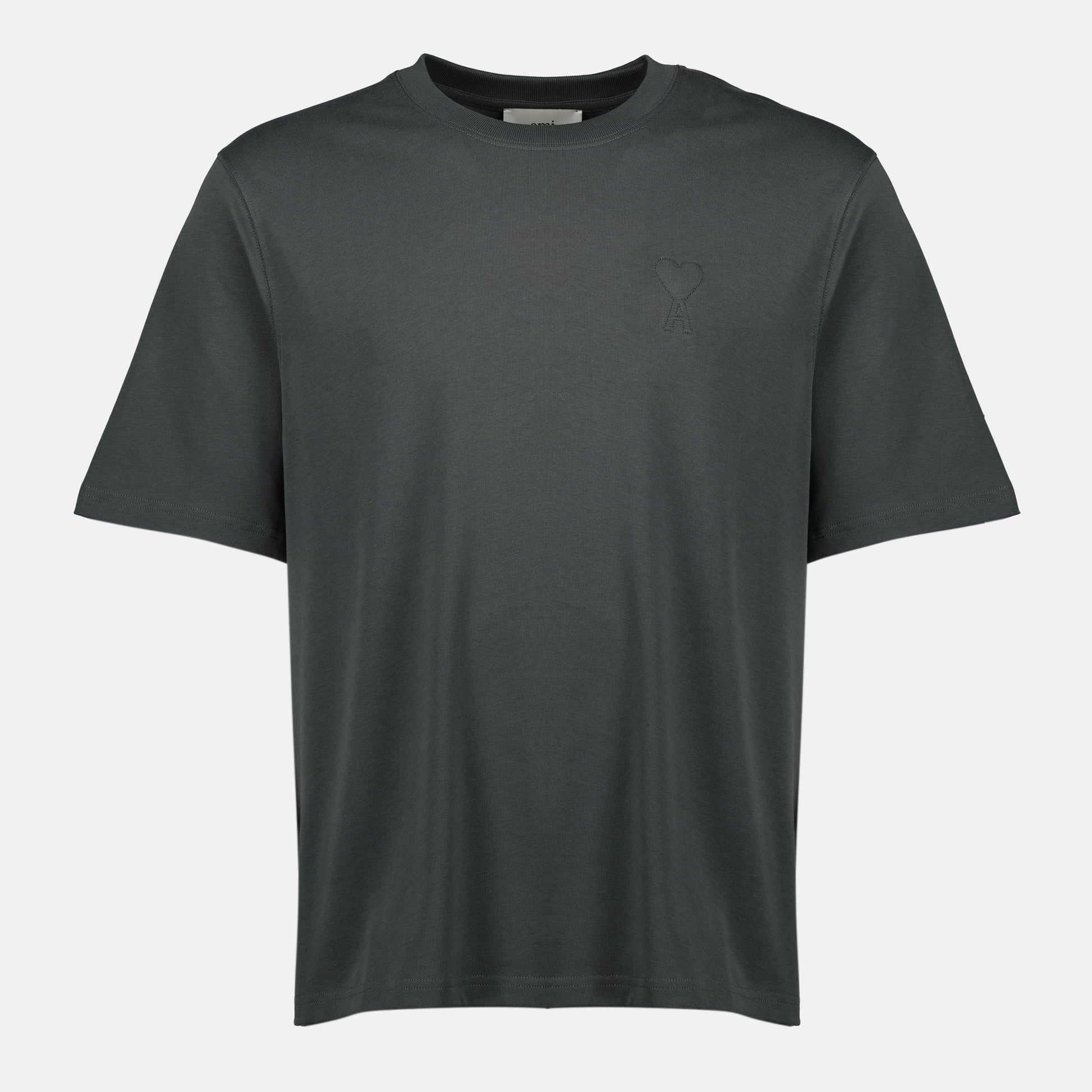 Le T-shirt logo gris d'AMI Paris est un modèle unisexe de la collection Automne-Hiver 2025. Il présente un col rond, des manches courtes et un logo brodé sur la poitrine.