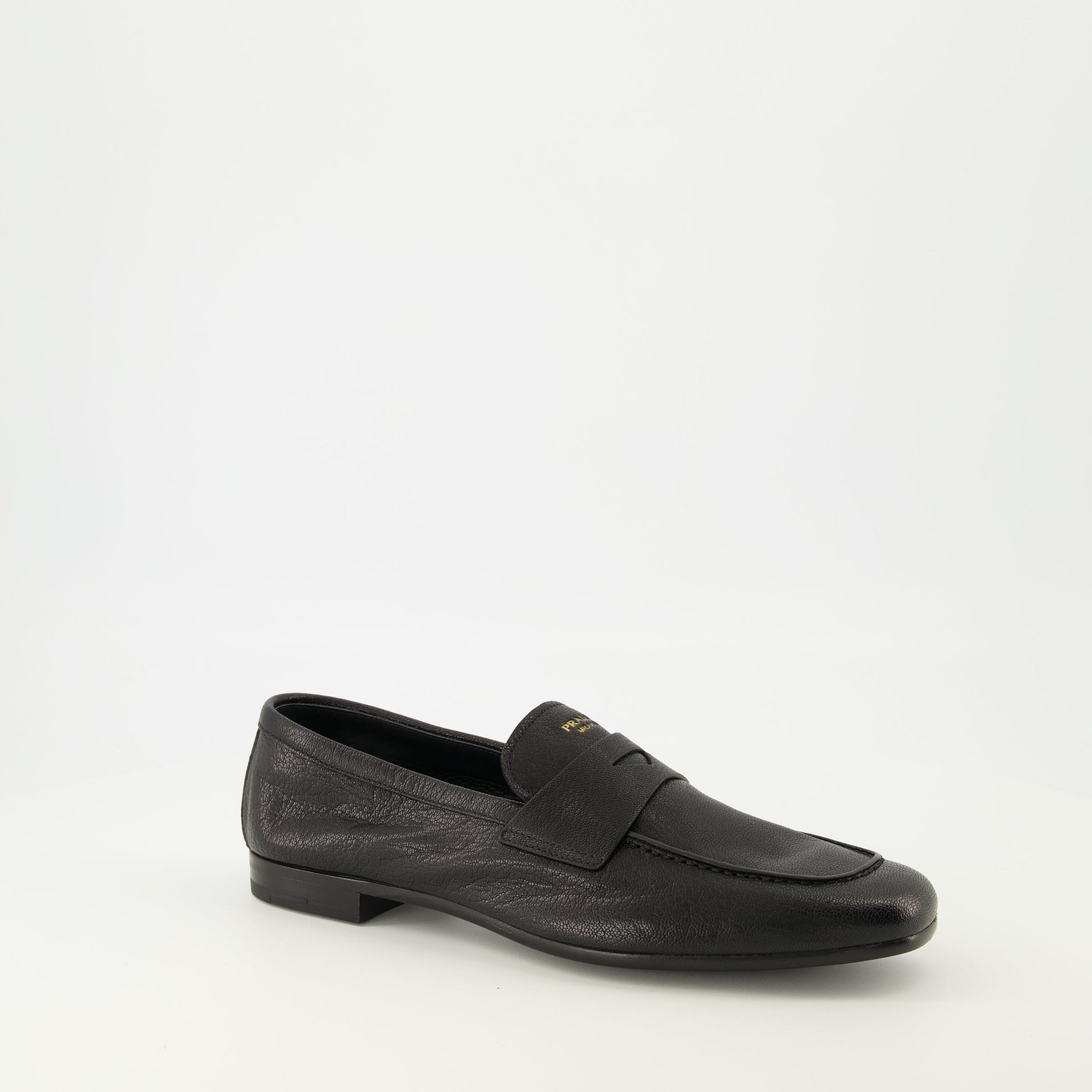 Black leather loafers from the brand Prada, designed for men. They are part of the Spring-Summer 2026 collection and are made of goat leather.