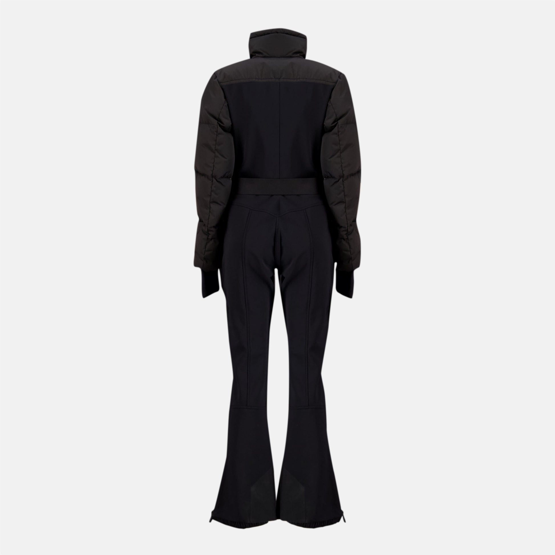 The black ski suit from Moncler Grenoble is designed for women. It is part of the Autumn-Winter 2025 collection and is made from waterproof nylon.