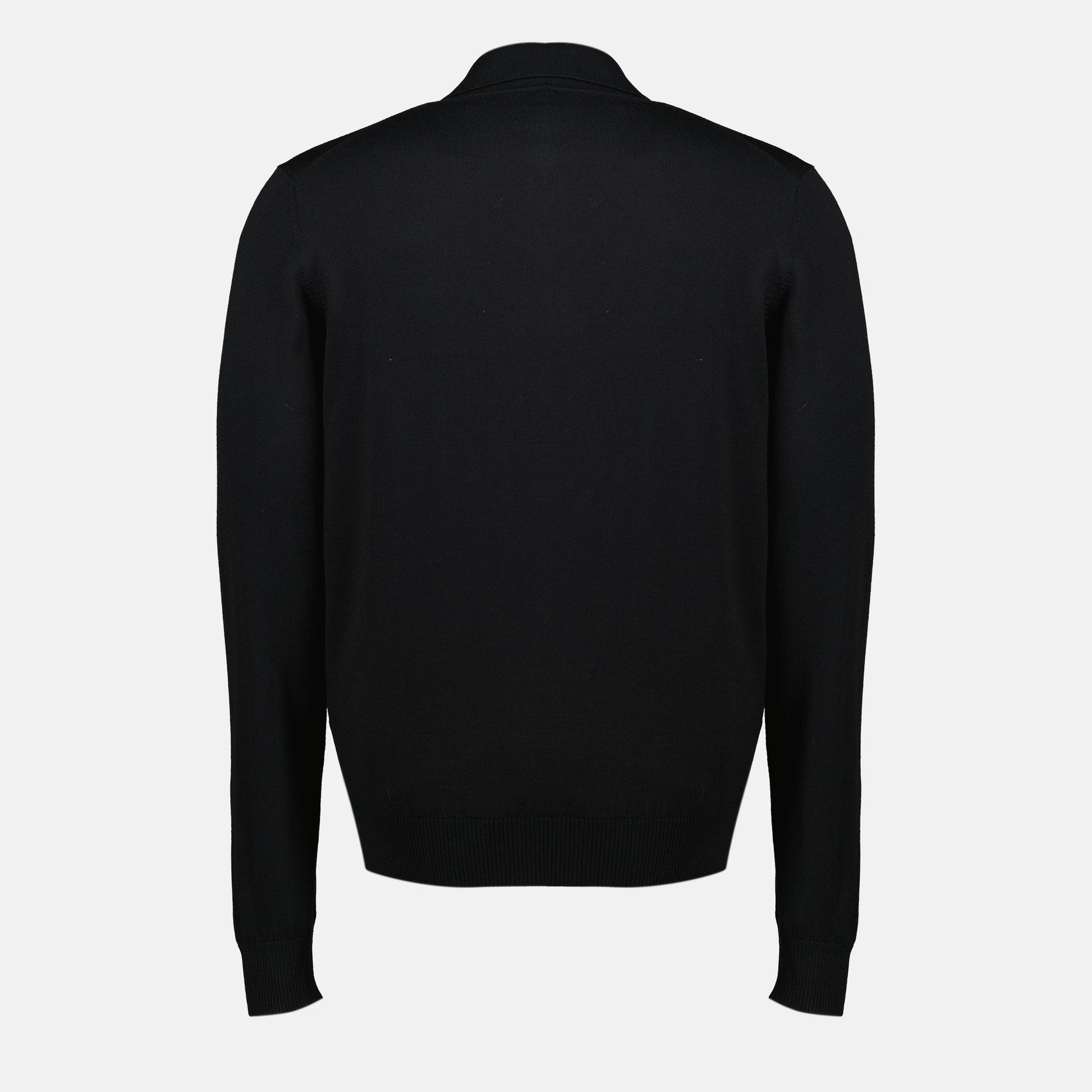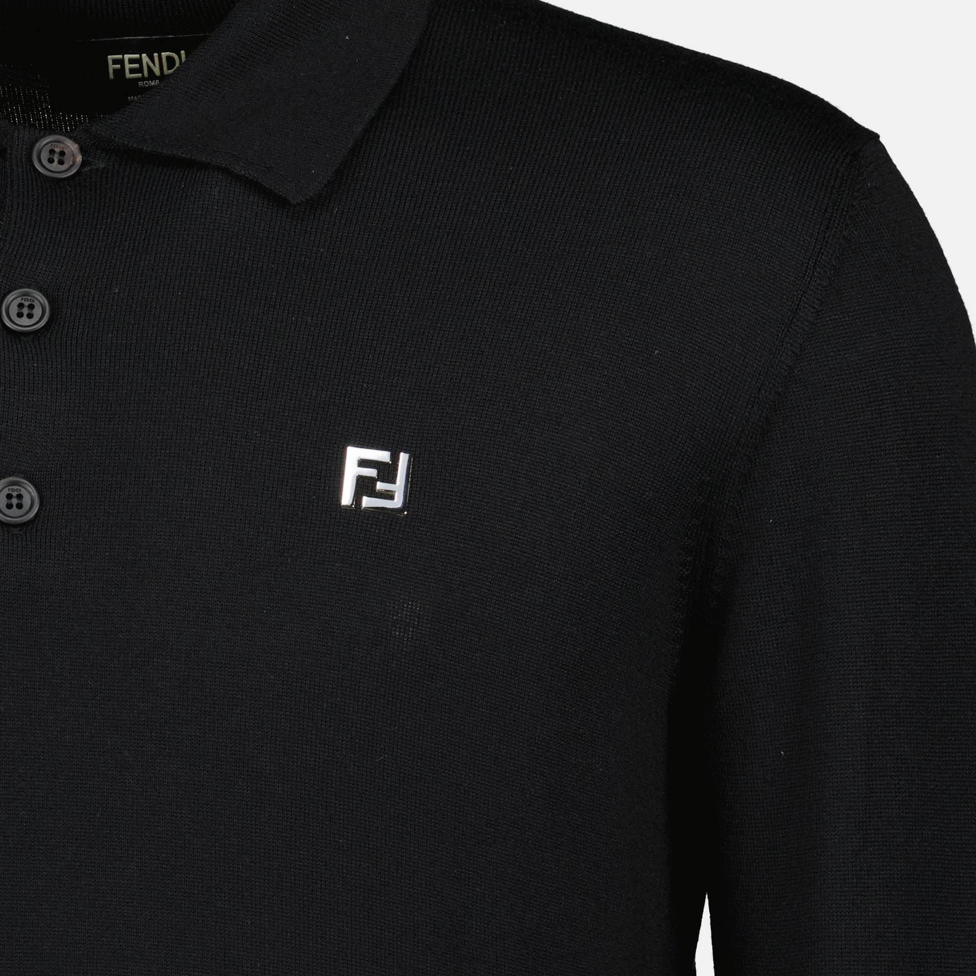 Black wool polo by Fendi for men. It is part of the Fall-Winter 2025 collection and features a classic collar with a three-button closure.