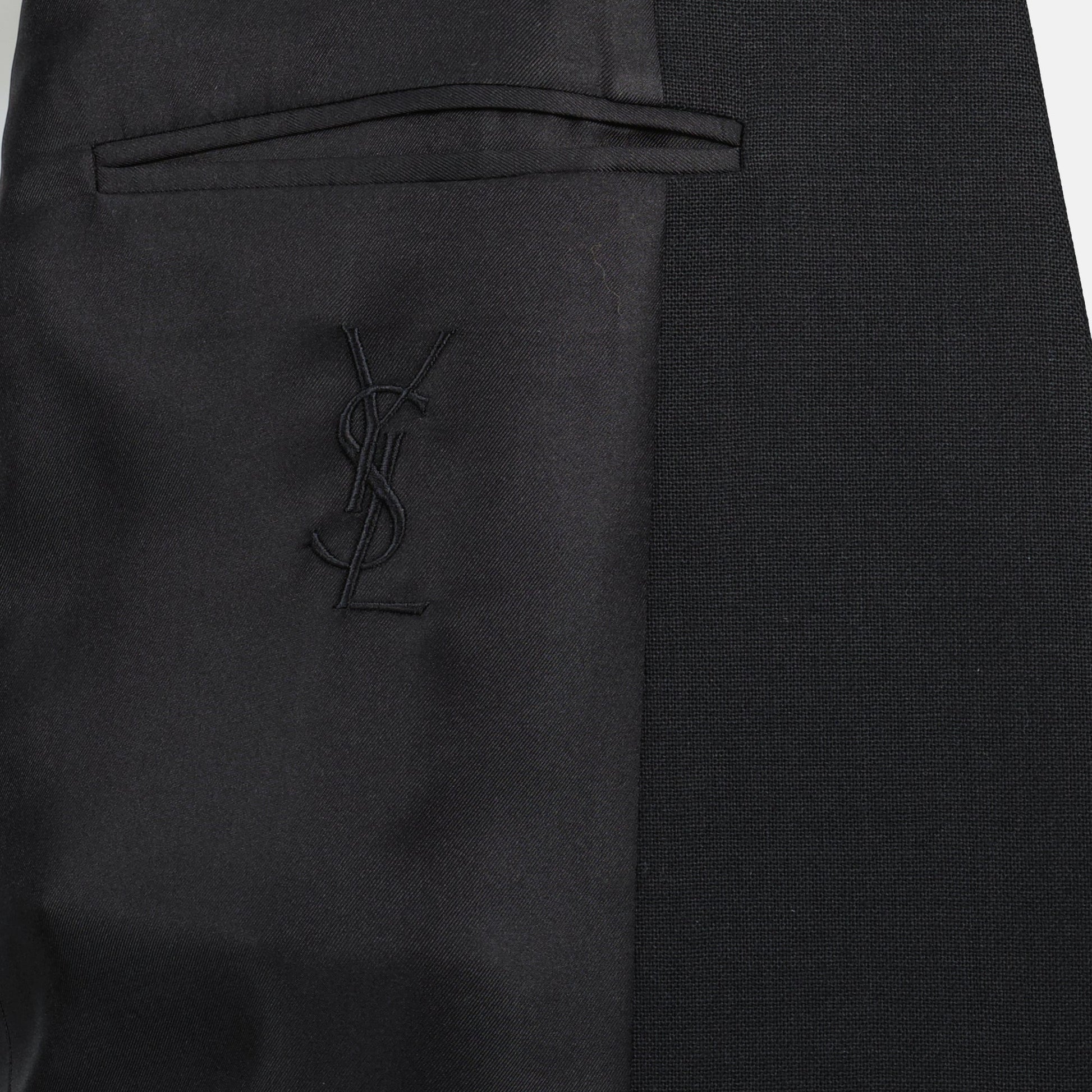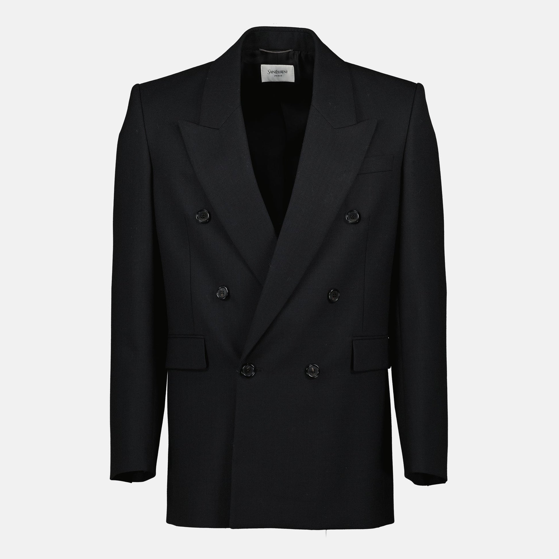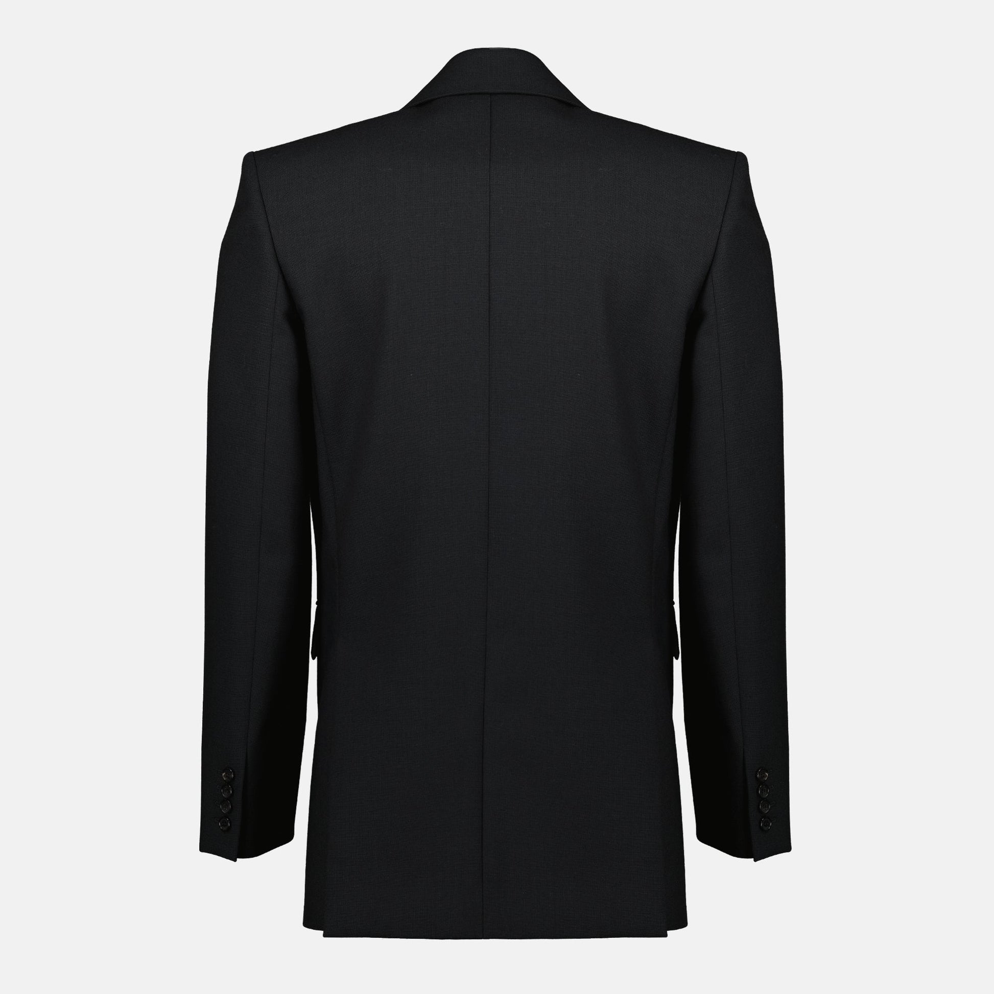 Black wool blazer from Saint Laurent for men. It is part of the Autumn-Winter 2025 collection and features a notched collar and a straight cut.