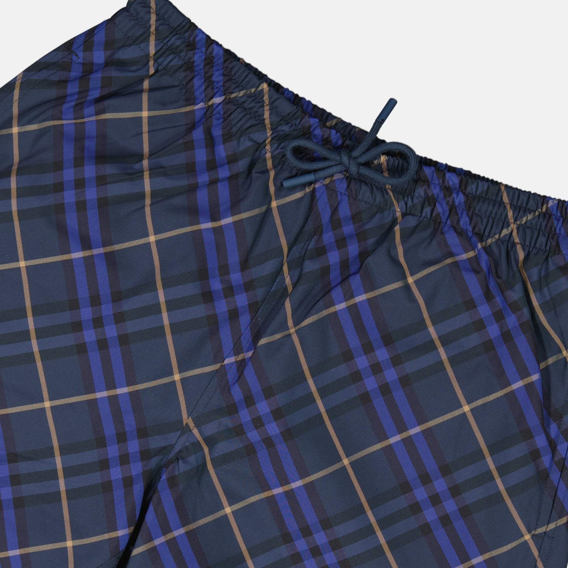 Blue plaid swimsuit by Burberry for men. It is part of the Spring-Summer 2025 collection and is made from nylon with a straight cut and practical details.