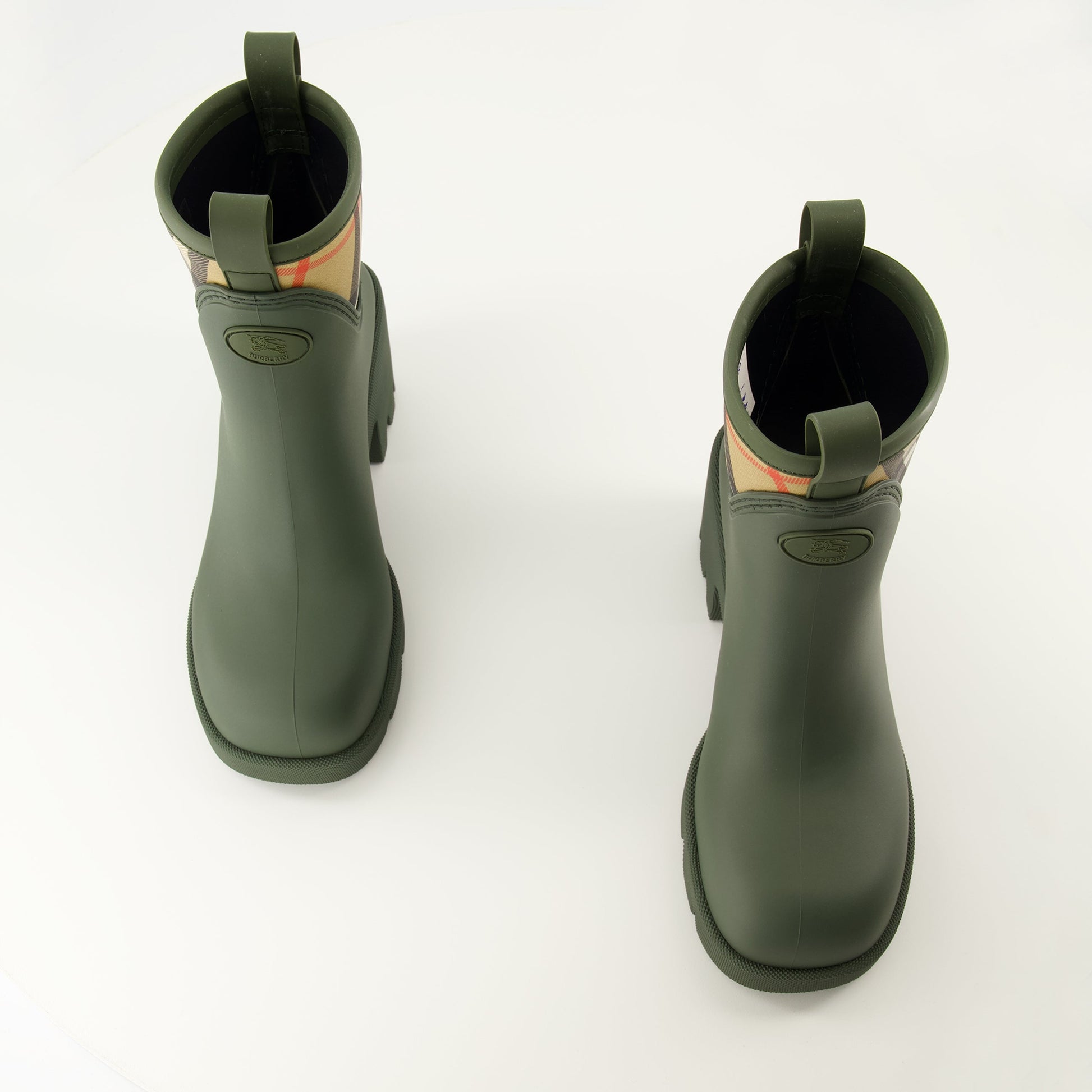 The Marsh rubber ankle boots in green from Burberry, designed for women, combine style and comfort. They are part of the Fall-Winter 2025 collection, featuring an elegant and practical design.