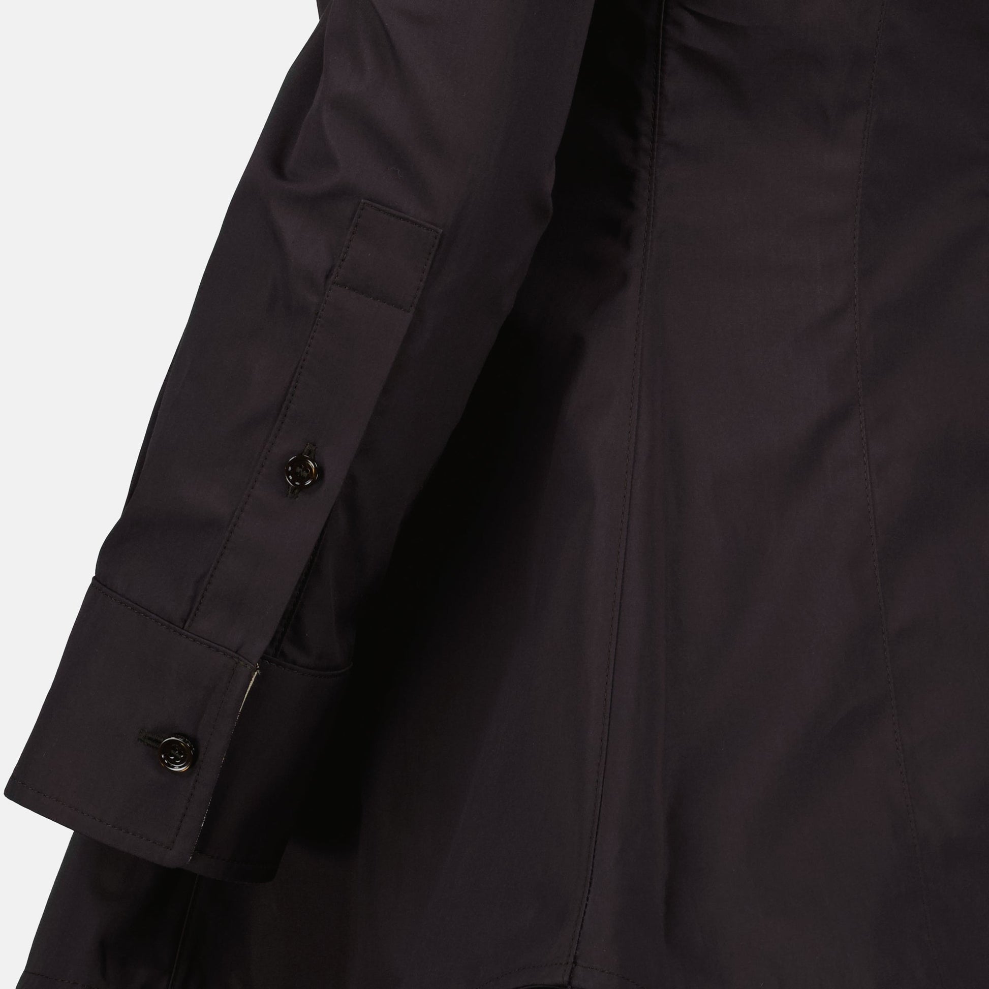 Brown poplin shirt from Burberry for women, from the Autumn-Winter 2025 collection. This slim-fit model features a notch collar, distinguished by its embroidered logo and long sleeves.
