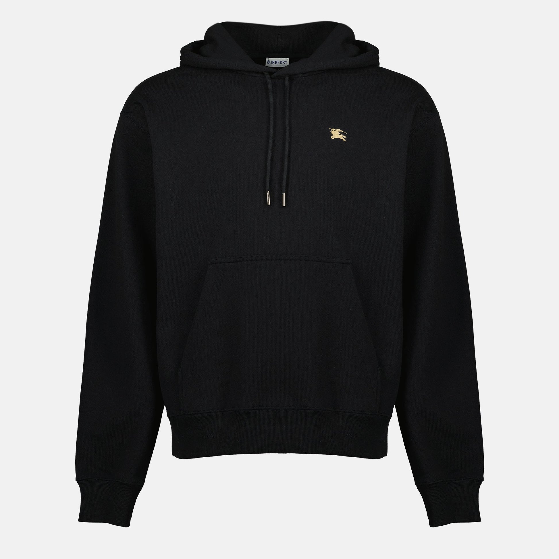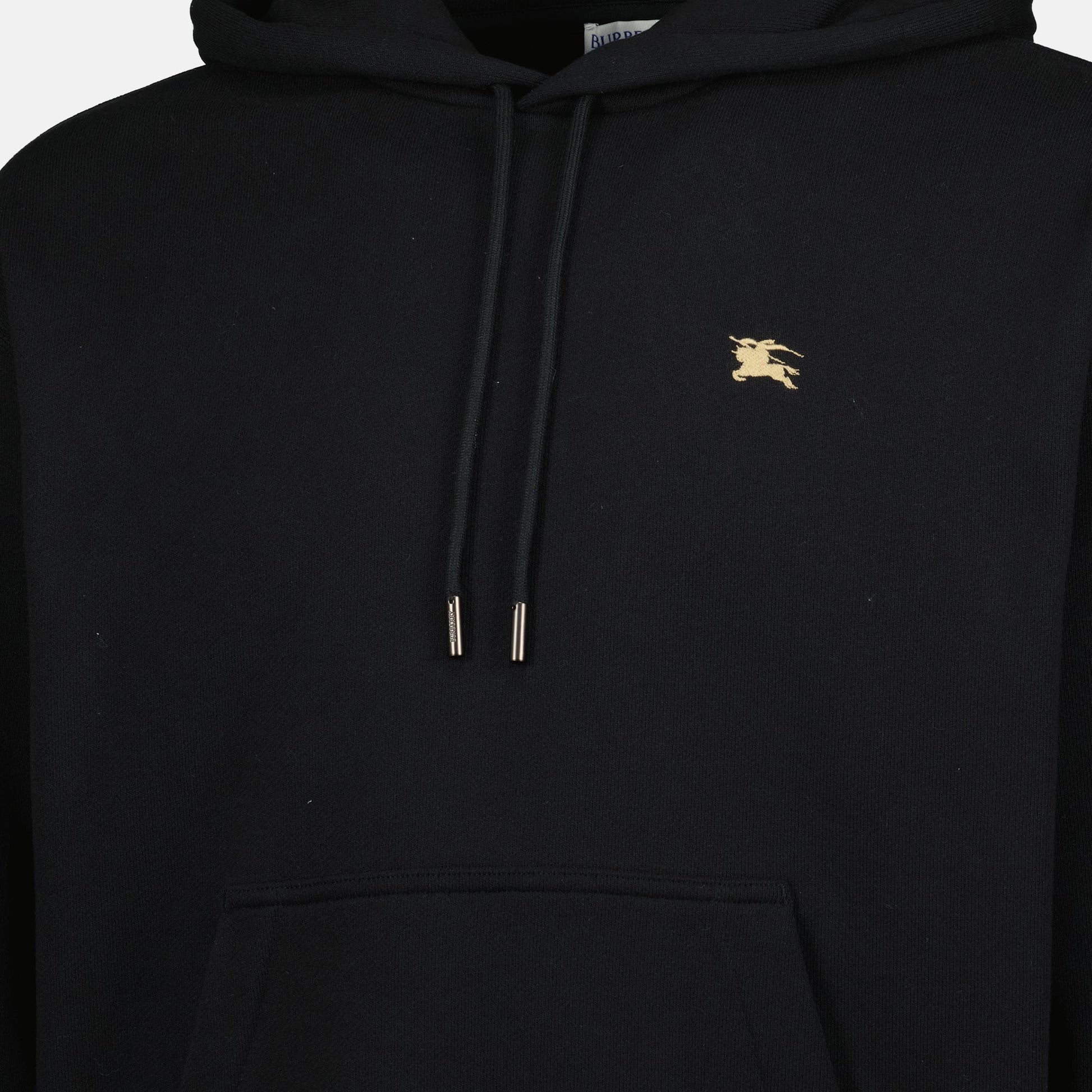 The black Knight hoodie from Burberry is a men's garment from the Autumn-Winter 2025 collection. It features a sleek design with an embroidered logo and a straight cut.