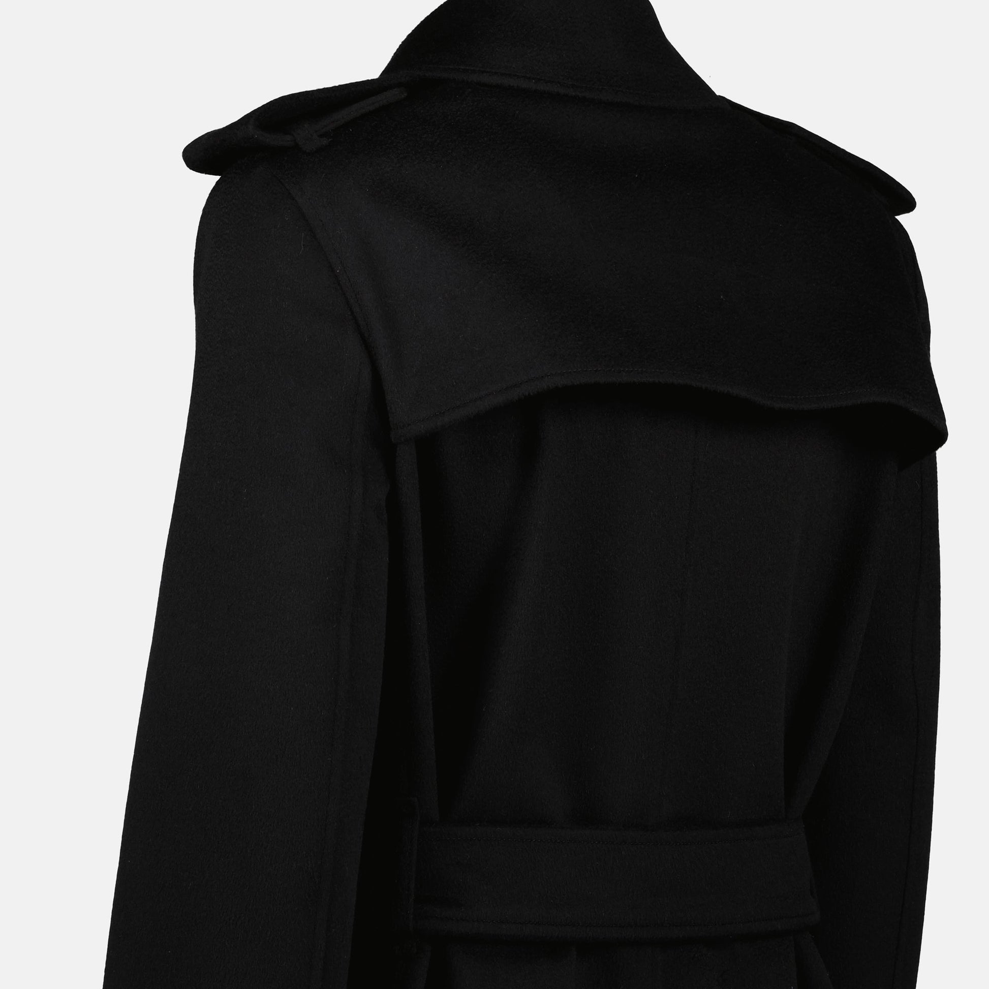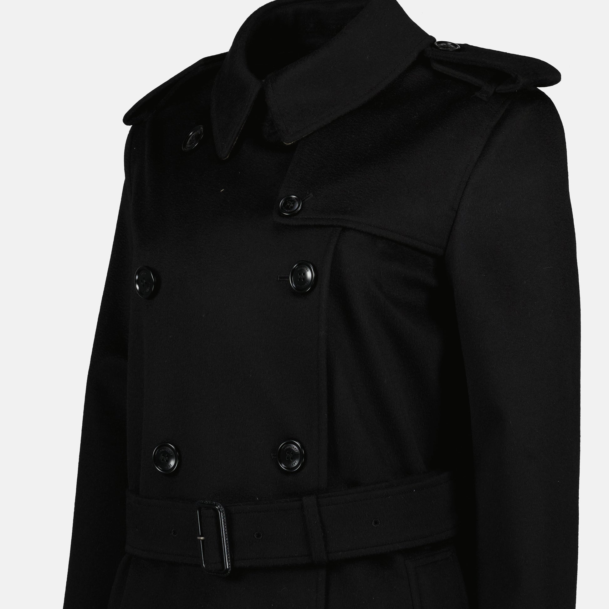 The black Kensington long trench from Burberry is an elegant piece for women, crafted from cashmere, wool, and cotton. It is part of the Autumn-Winter 2025 collection.