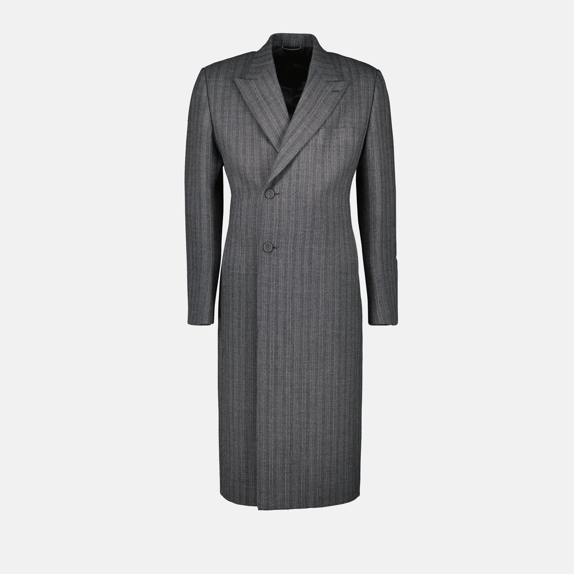 Long Bar coat from the Dior Autumn-Winter 2024 collection for Men. Made of wool. Item with a striped pattern. Peak lapel and long sleeves.