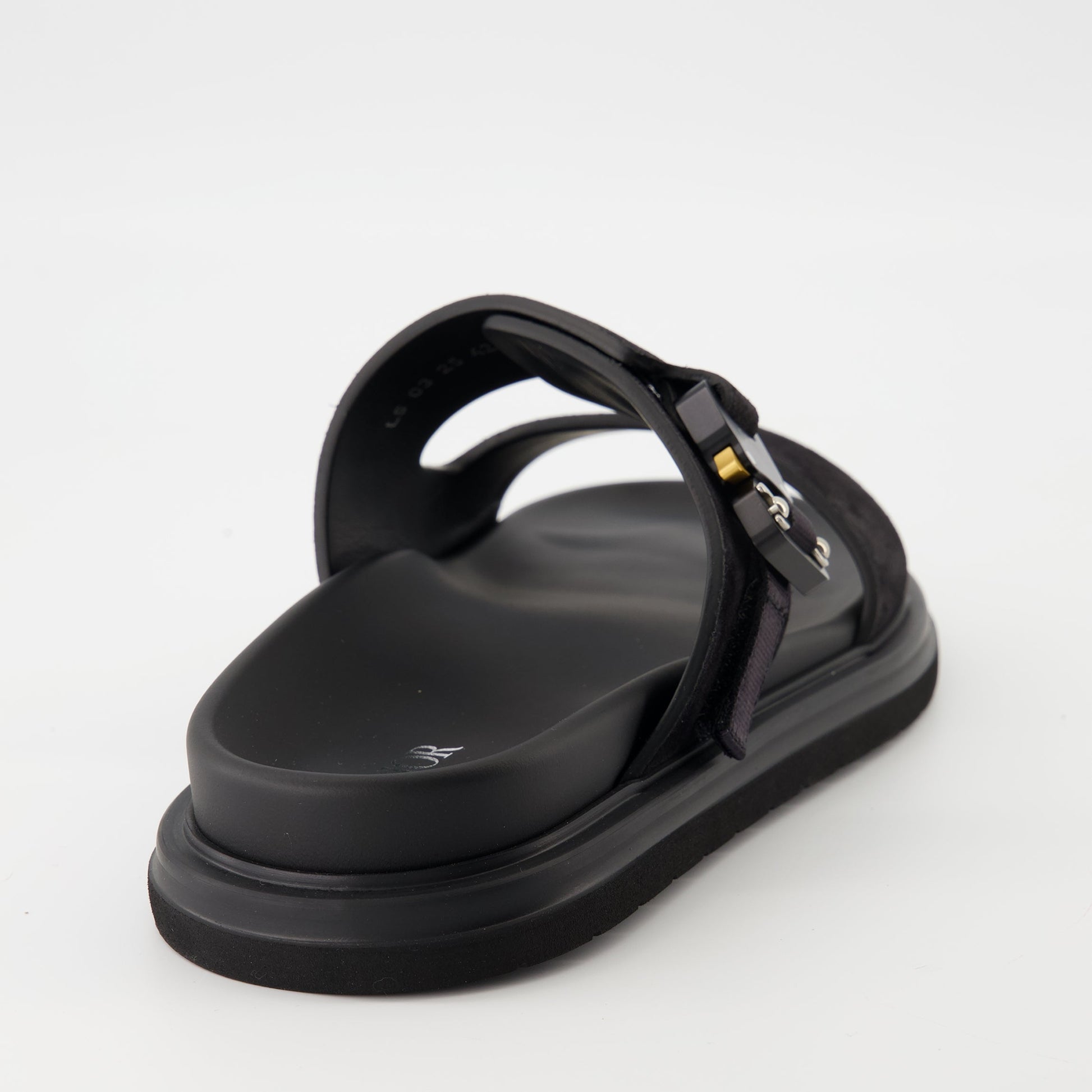 The black Aqua Sandals from Dior are men's shoes from the Autumn-Winter 2025 collection. They are made of calfskin and suede, featuring a slip-on design and an open toe.