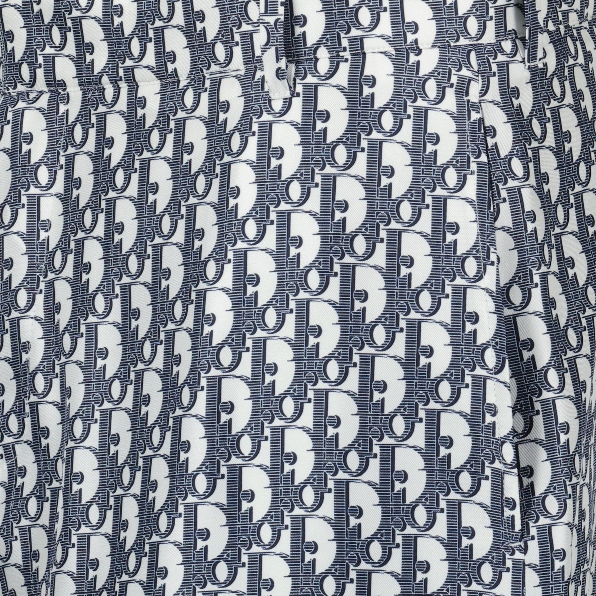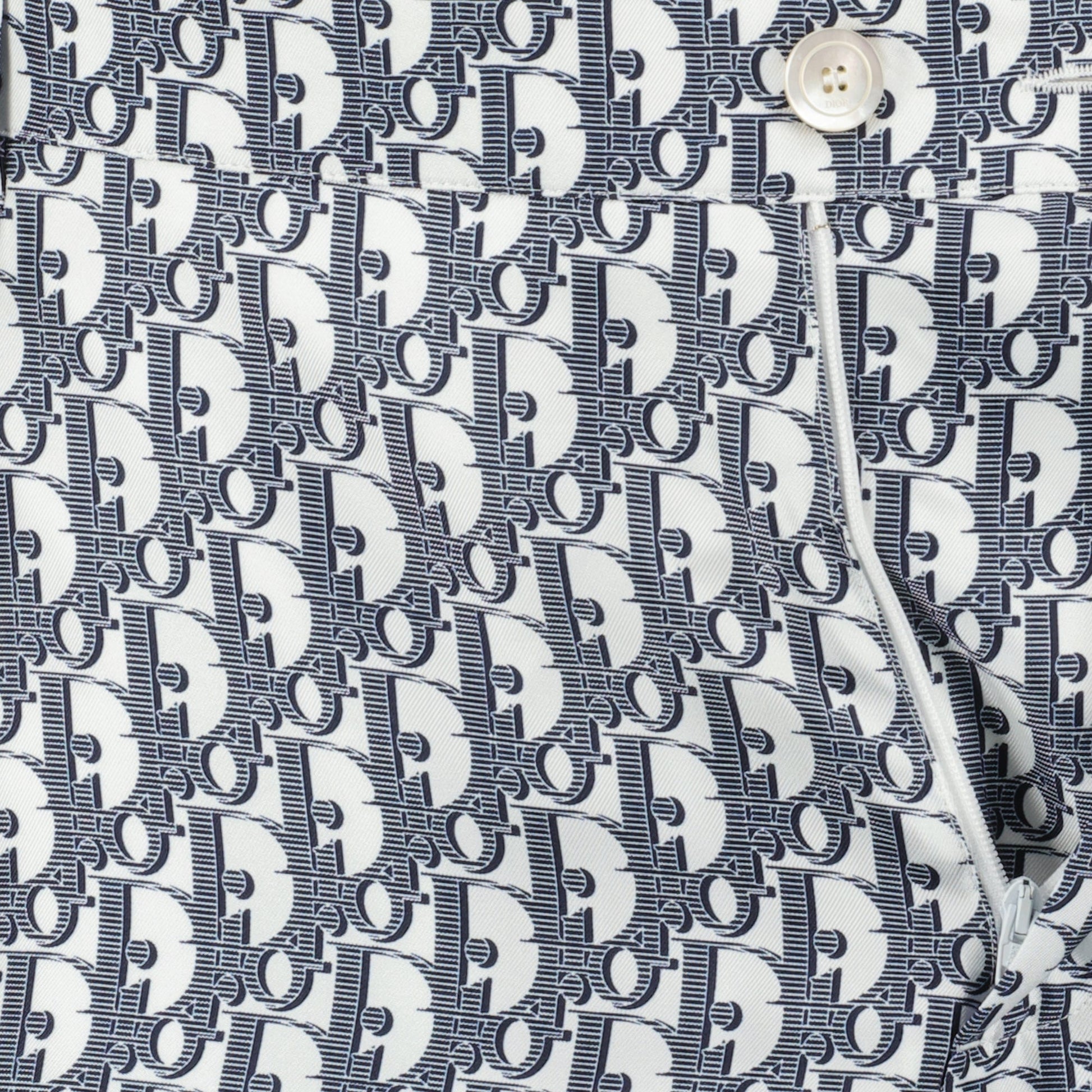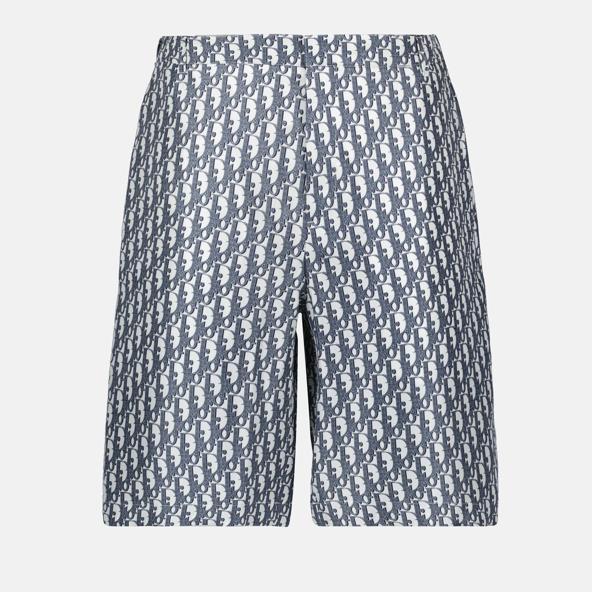Dior Oblique silk shorts from the brand Dior for men, part of the Spring-Summer 2025 collection. This blue and white two-tone model features a printed logo and a long cut.