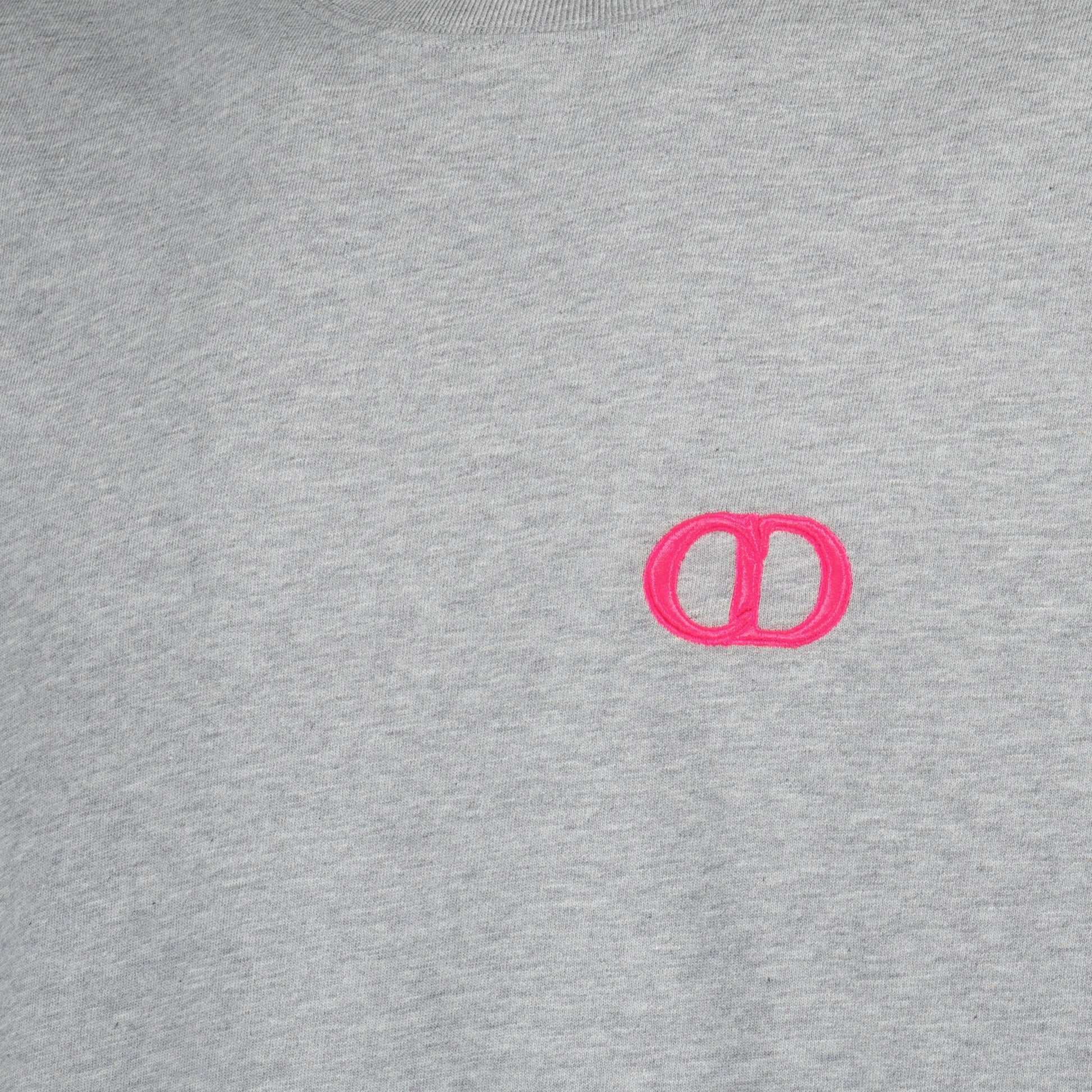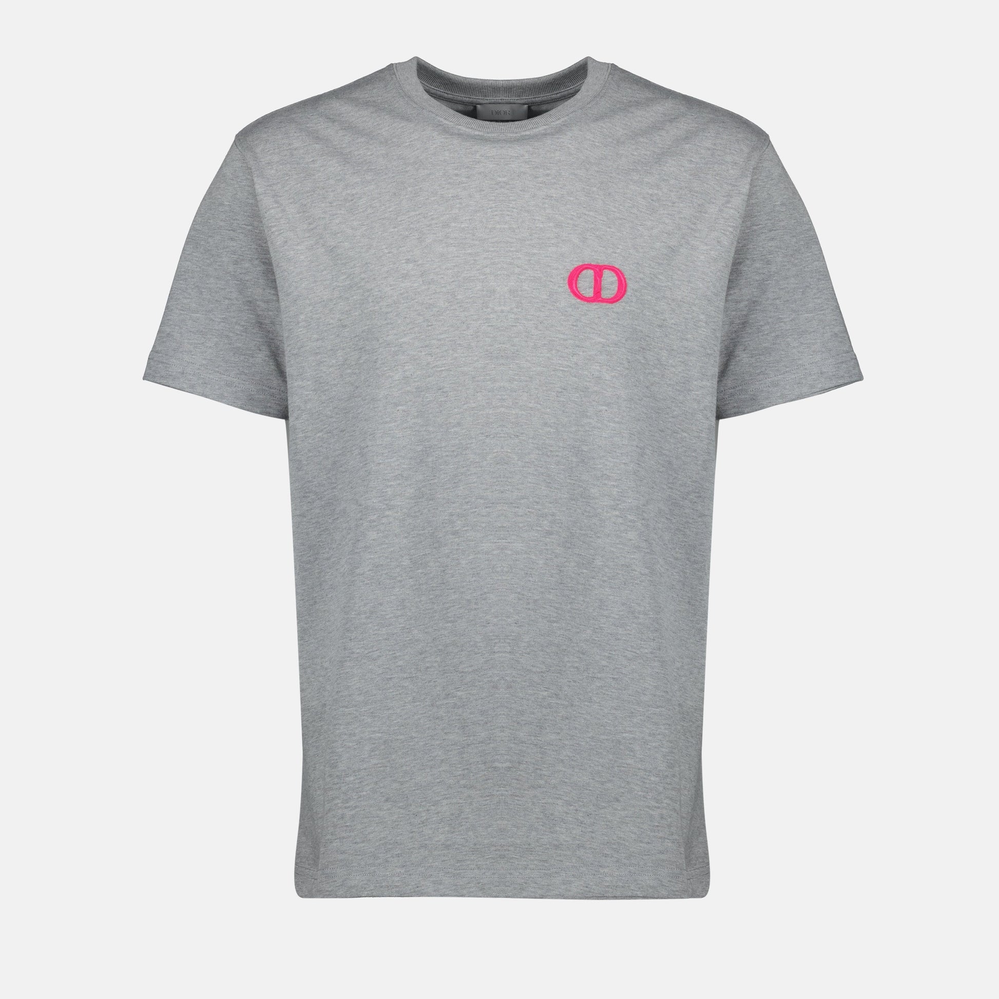 Gray CD embroidered T-shirt from Dior for men, made of cotton. This model is part of the Spring-Summer 2025 collection and features an embroidered logo in pink on the chest.