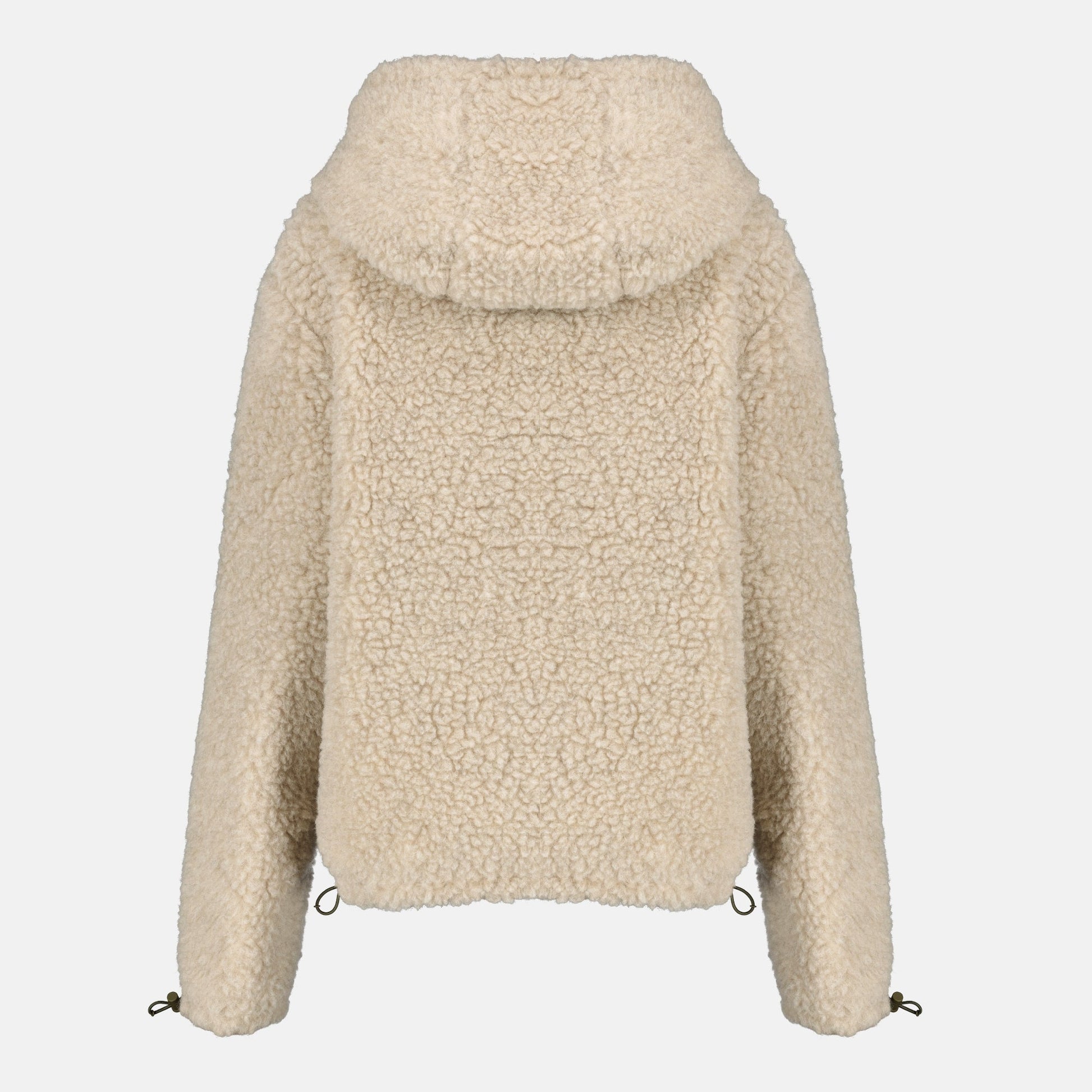 Teddy down jacket by Miu Miu for women, Spring-Summer 2026 collection. It is made of wool with goose down padding and features an adjustable hood.