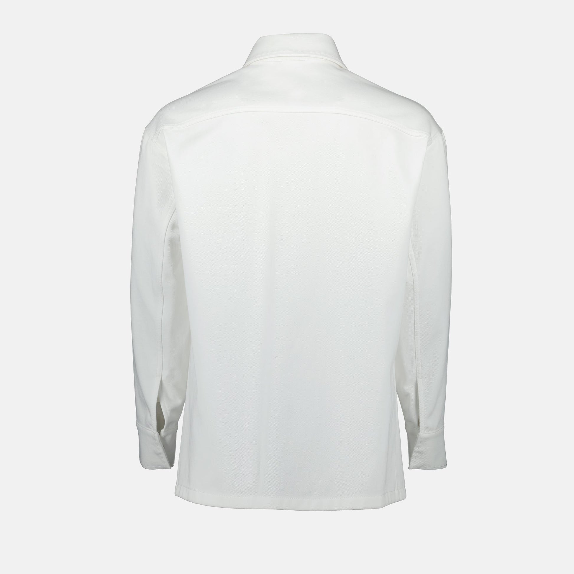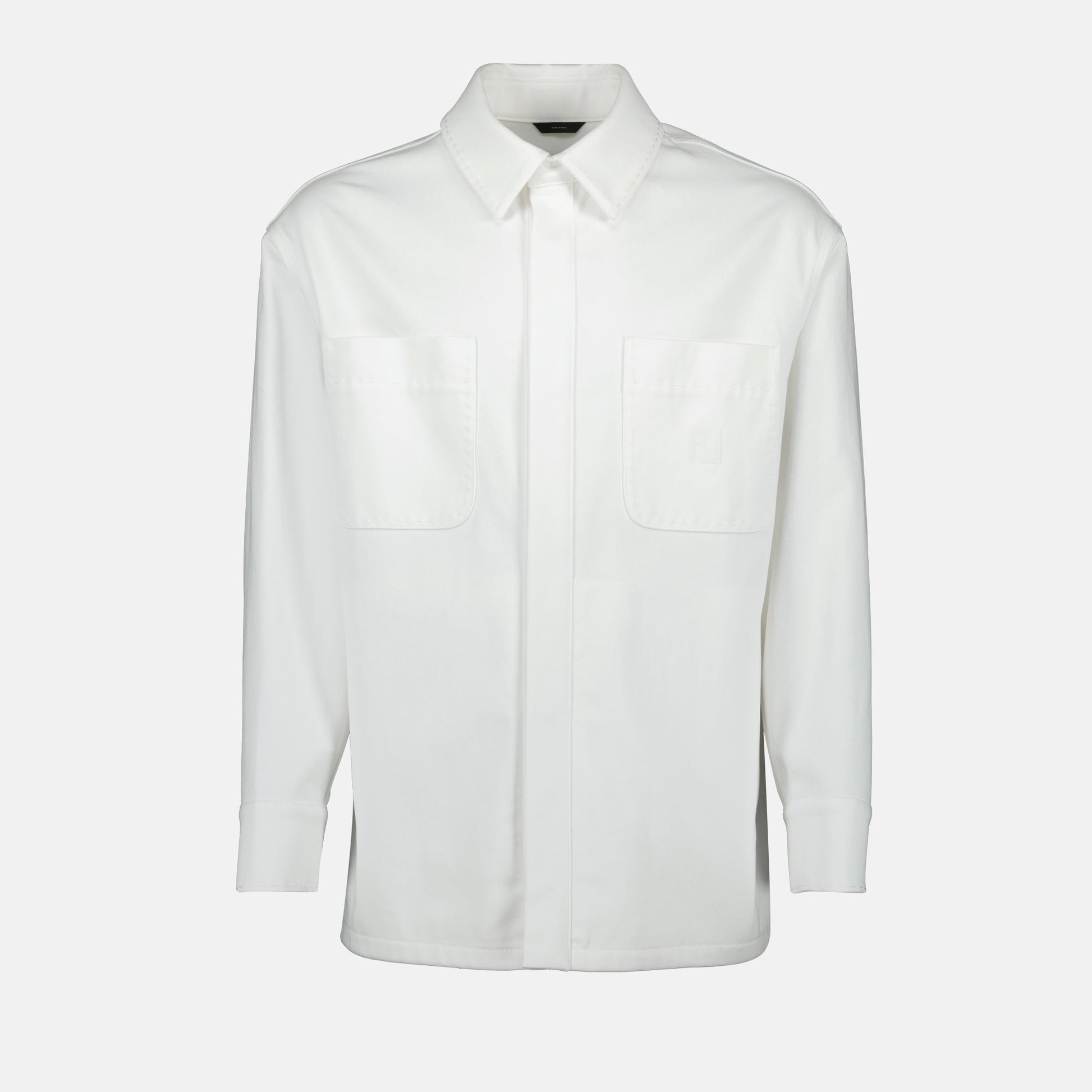 White denim jacket for men by Fendi from the Spring-Summer 2025 collection. Made from cotton, it features a classic collar, long sleeves, and elegant details.