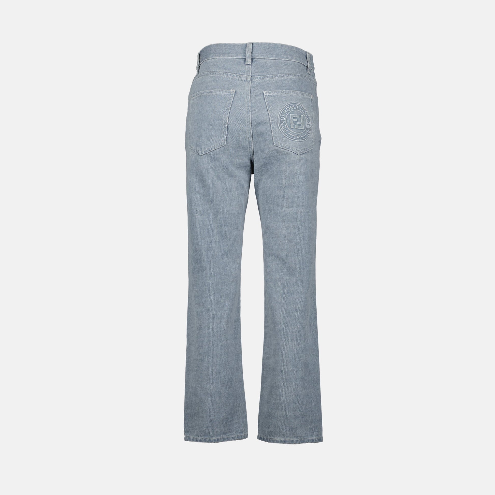 Blue denim pants from Fendi for women, Spring-Summer 2025 collection. They feature a straight cut, high waist, and a Fendi Stamp 1925 patch on the back pocket.