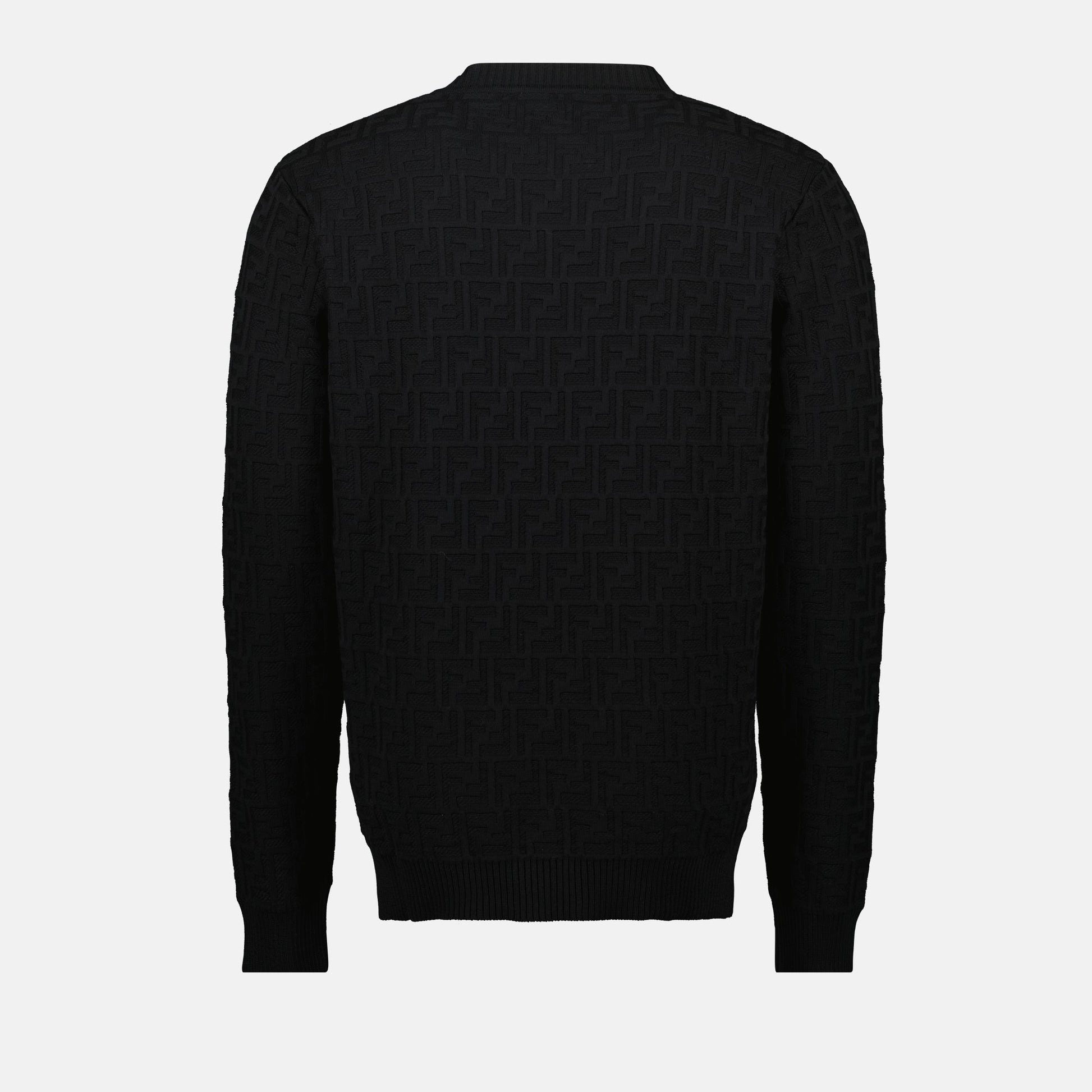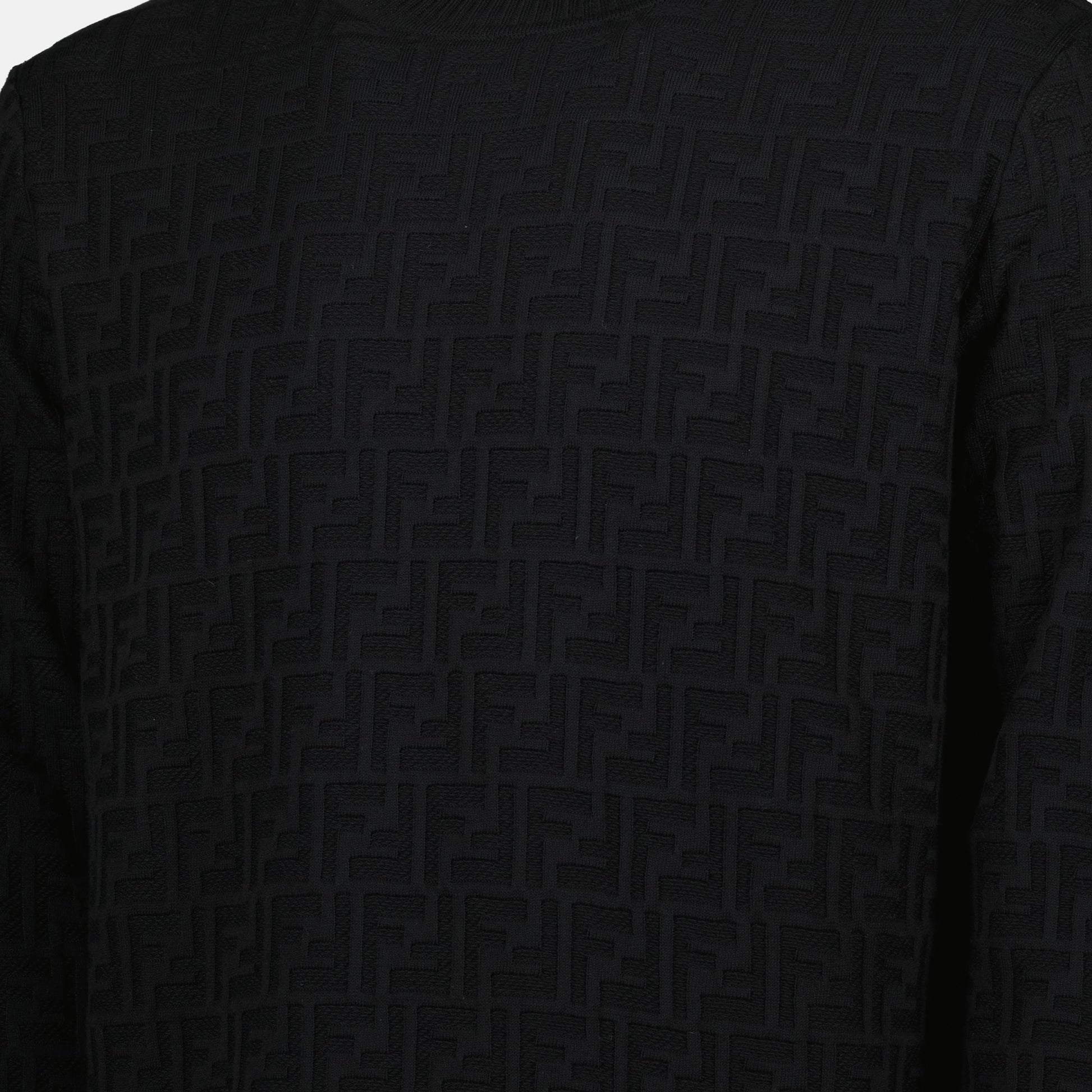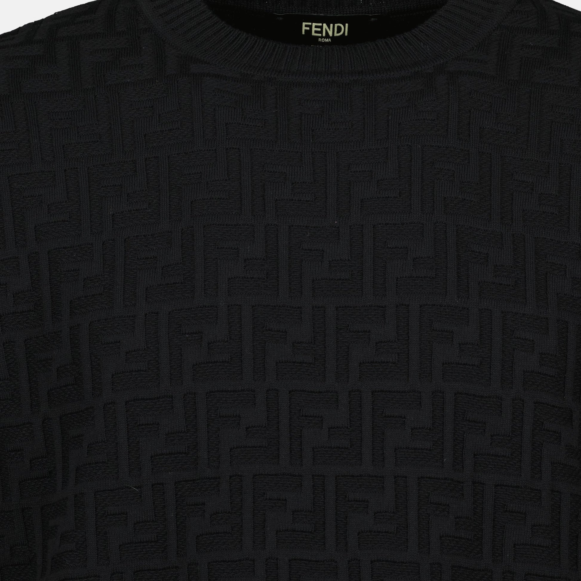 The black FF sweater from Fendi is a men's garment from the Autumn-Winter 2025 collection. It features a round neck, long sleeves, and a distinctive logo print.