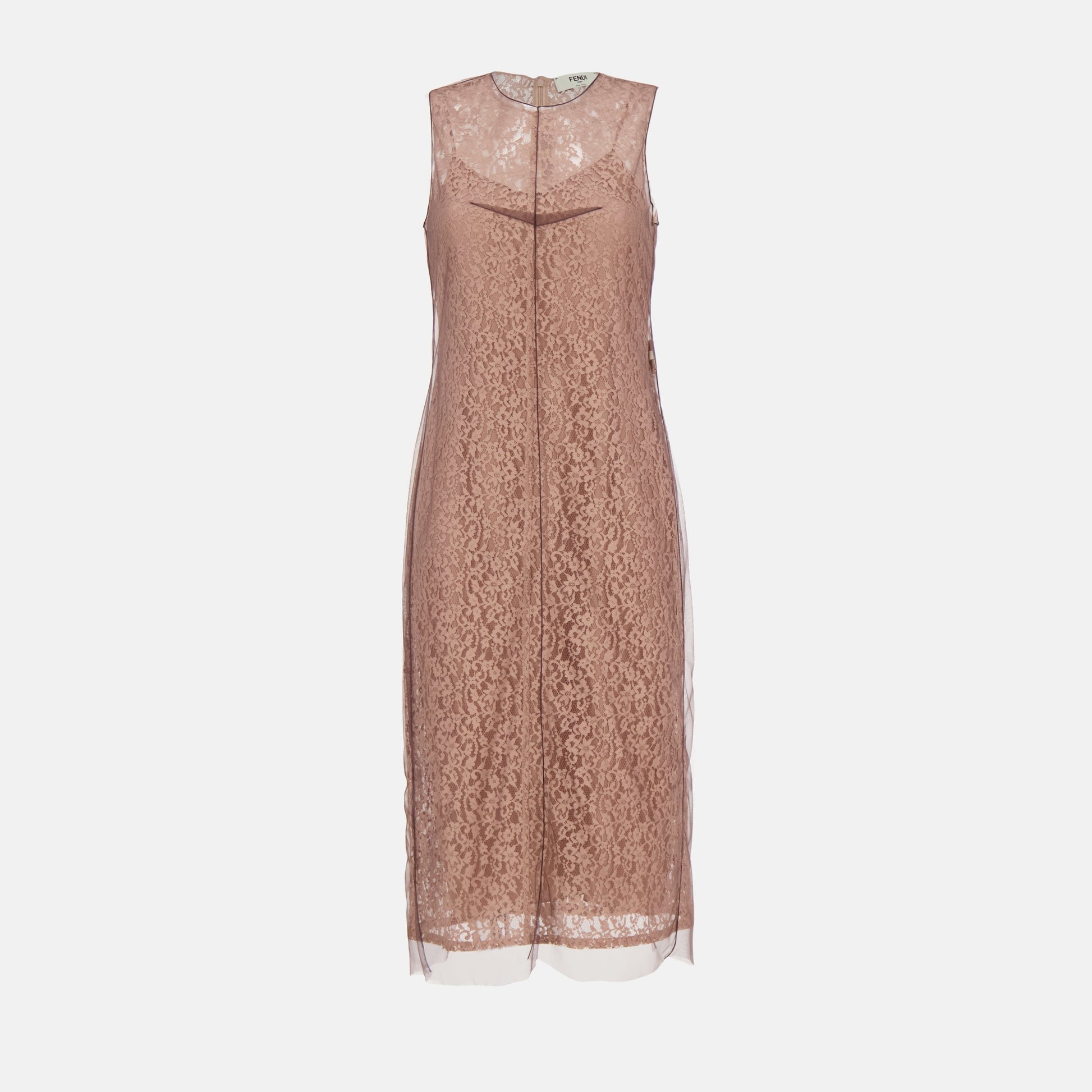 Pink lace dress by Fendi for women from the Spring-Summer 2025 collection. It features a round neckline, a mid-length fit, and exquisite details in floral lace and tulle.