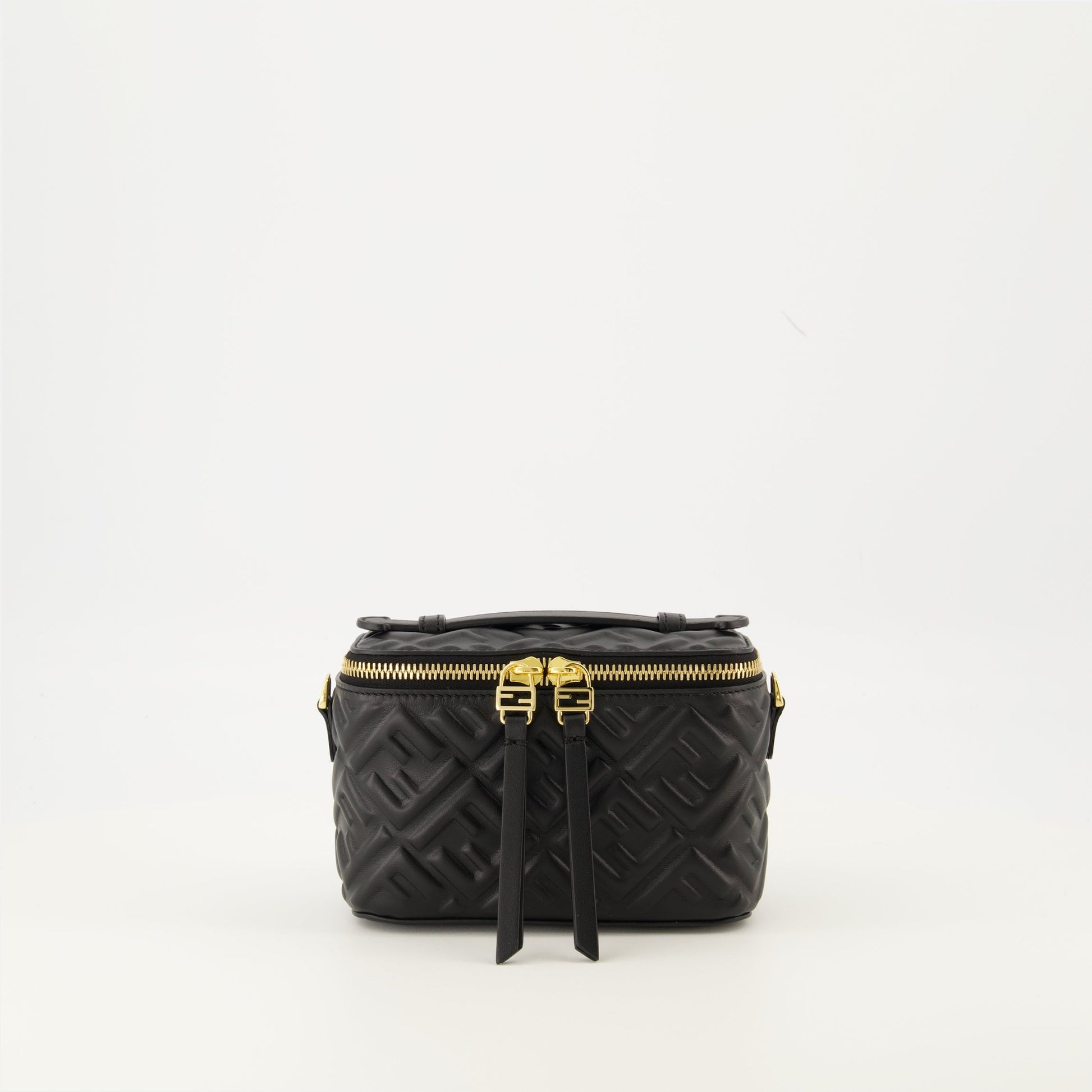 The black vanity bag by Fendi is an elegant accessory for women, crafted from lambskin leather with golden metallic accents. It is part of the Autumn-Winter 2025 collection.