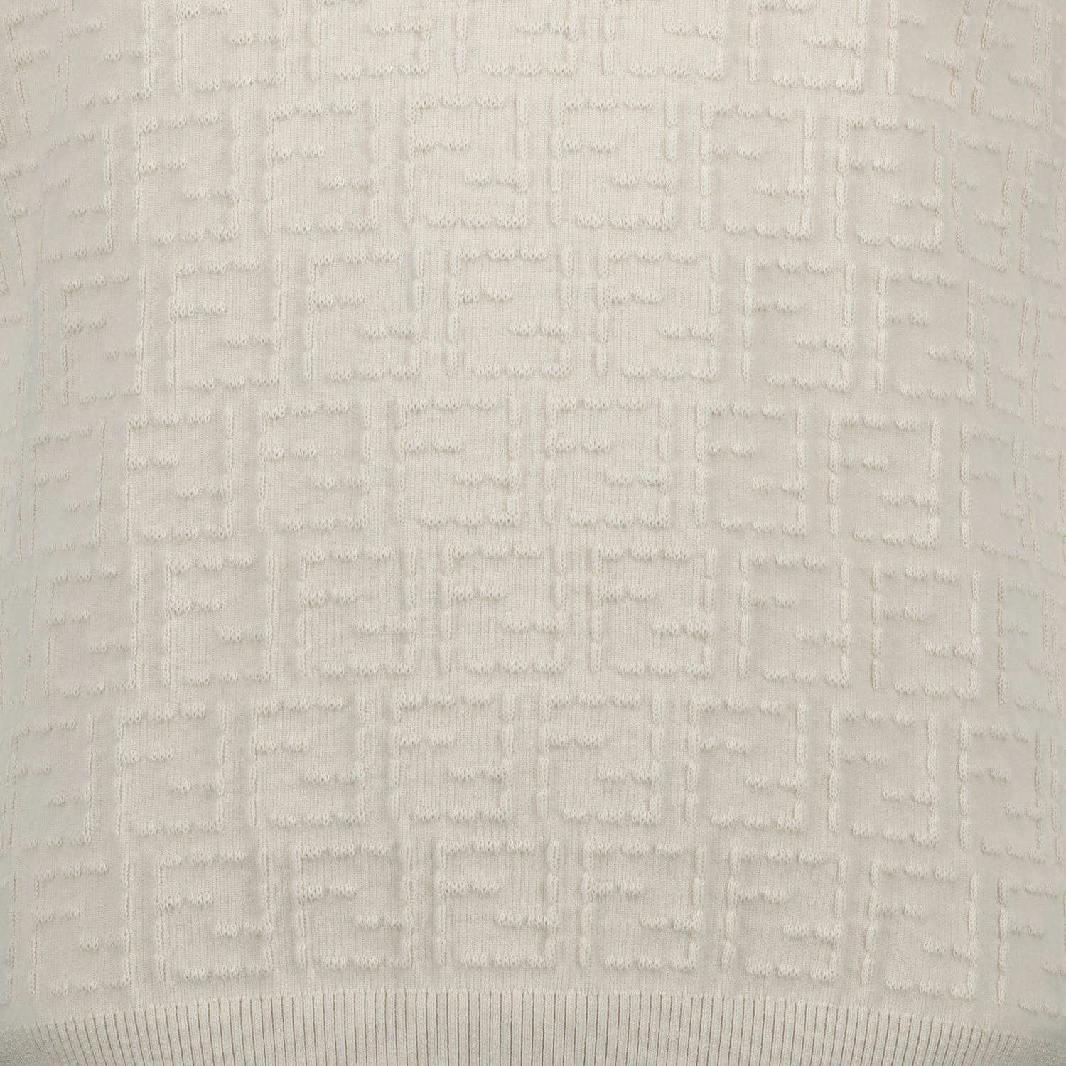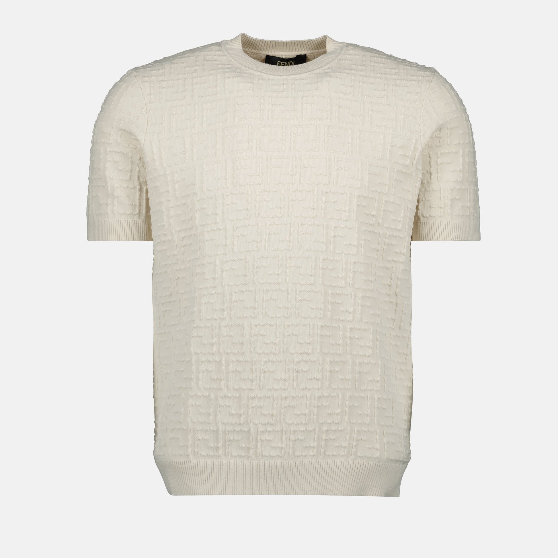 Selleria sweater in cotton from Fendi for men, Spring-Summer 2025 collection. It features a round neck, short sleeves, and an FF print throughout, made from cotton yarn.