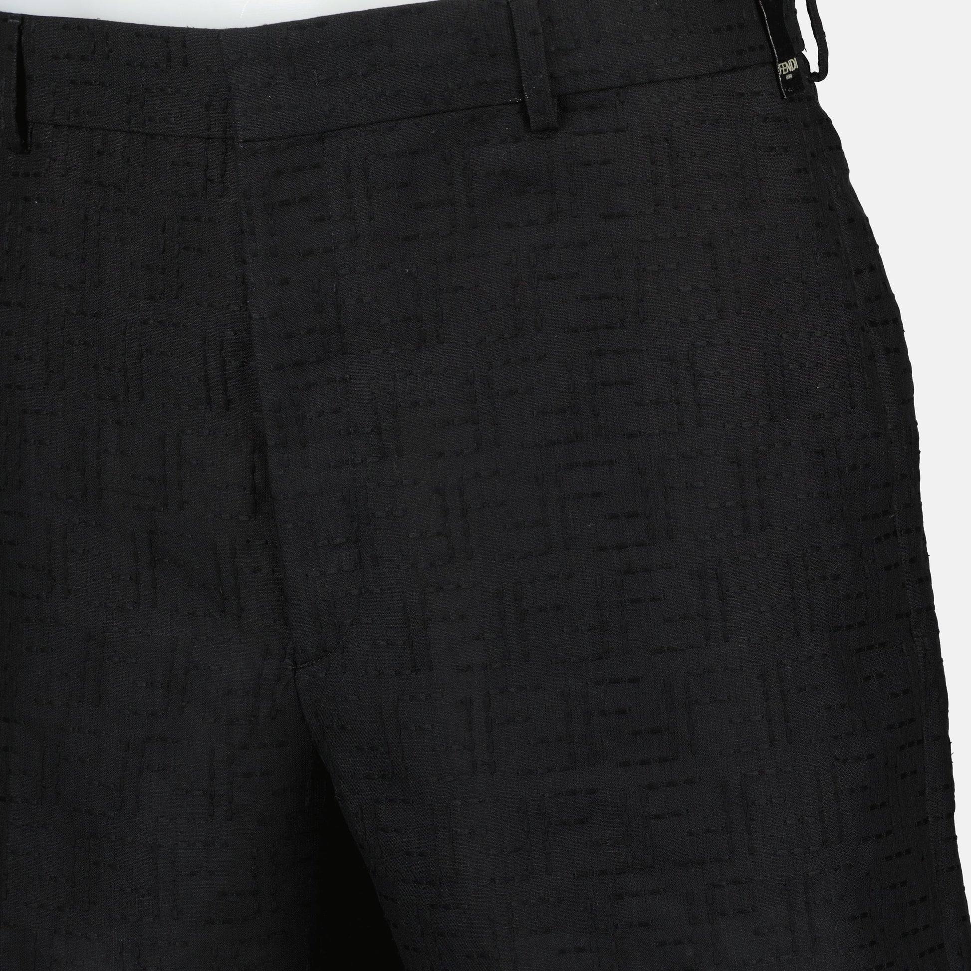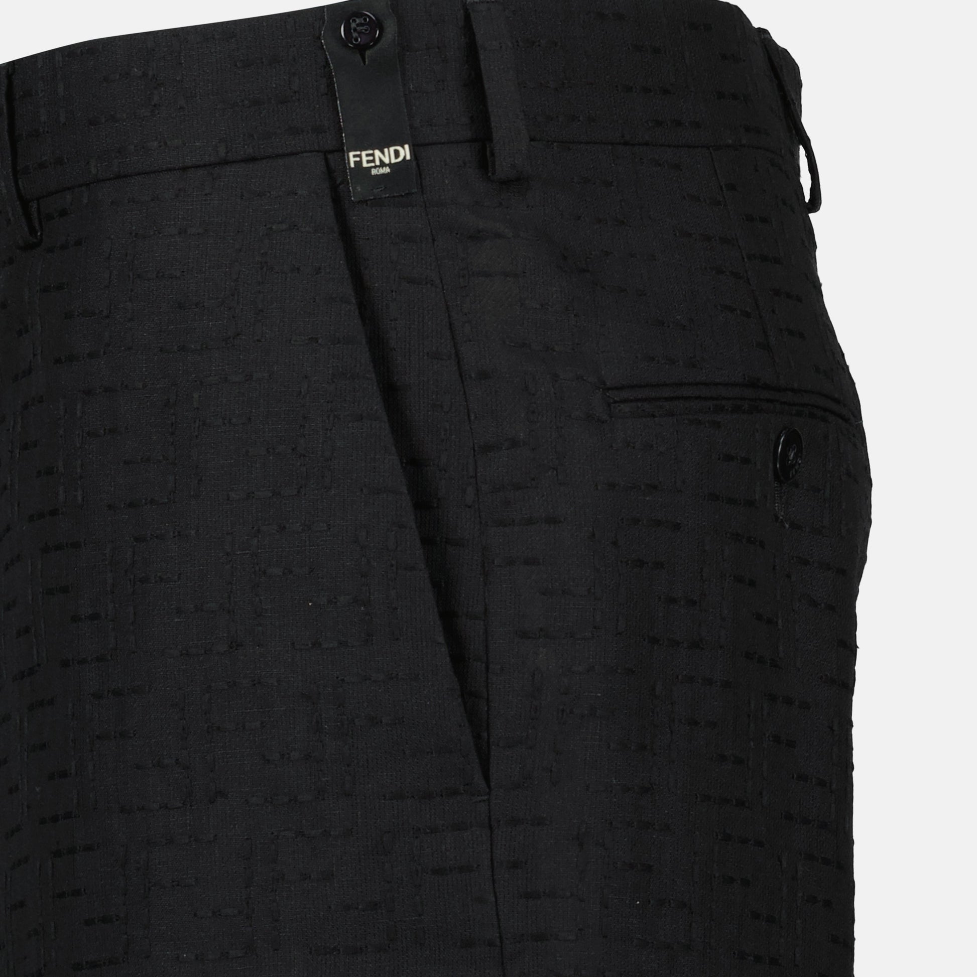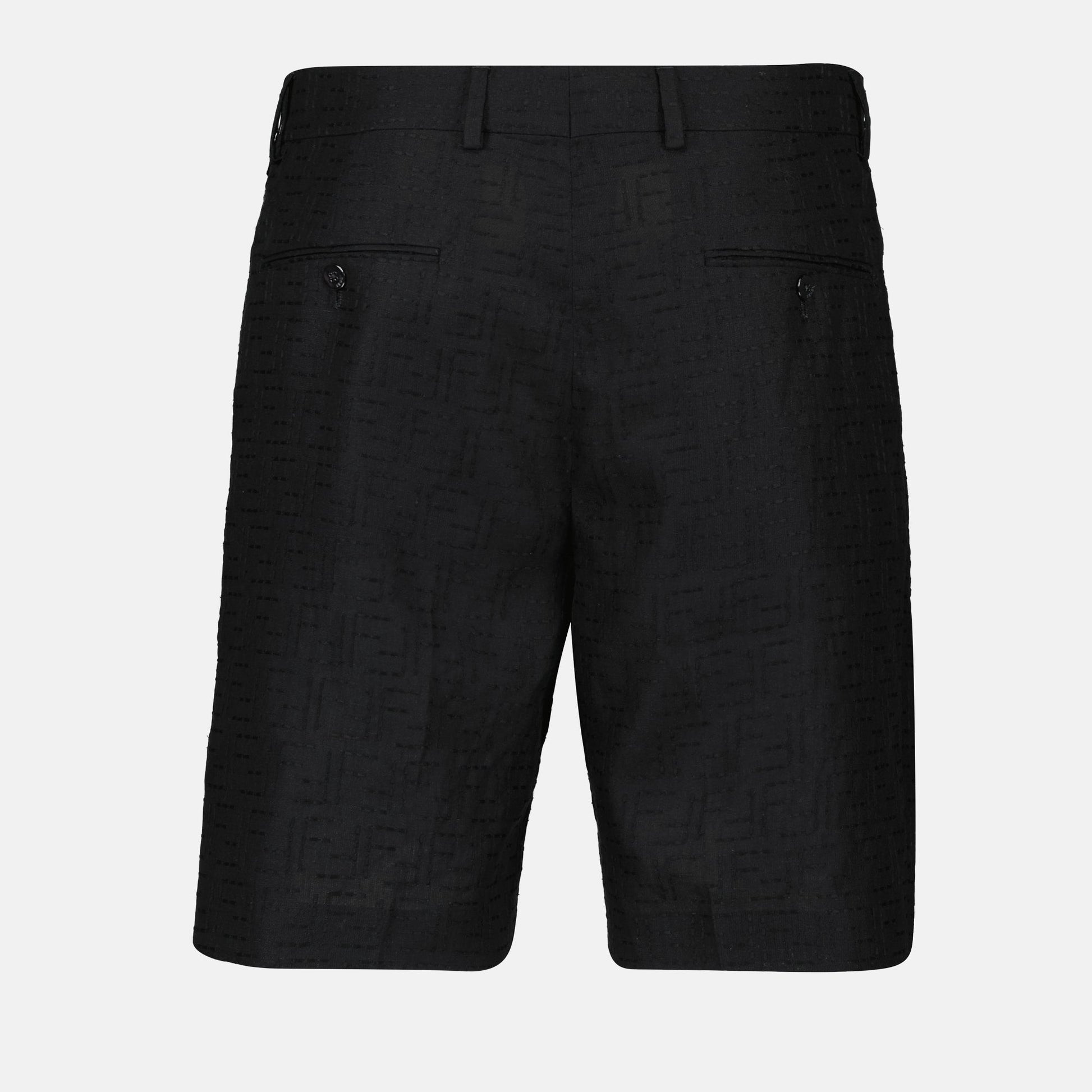 Black FF linen shorts for men from Fendi, part of the Spring-Summer 2025 collection. Made of cotton and linen fleece, it features a printed logo and patch pockets.