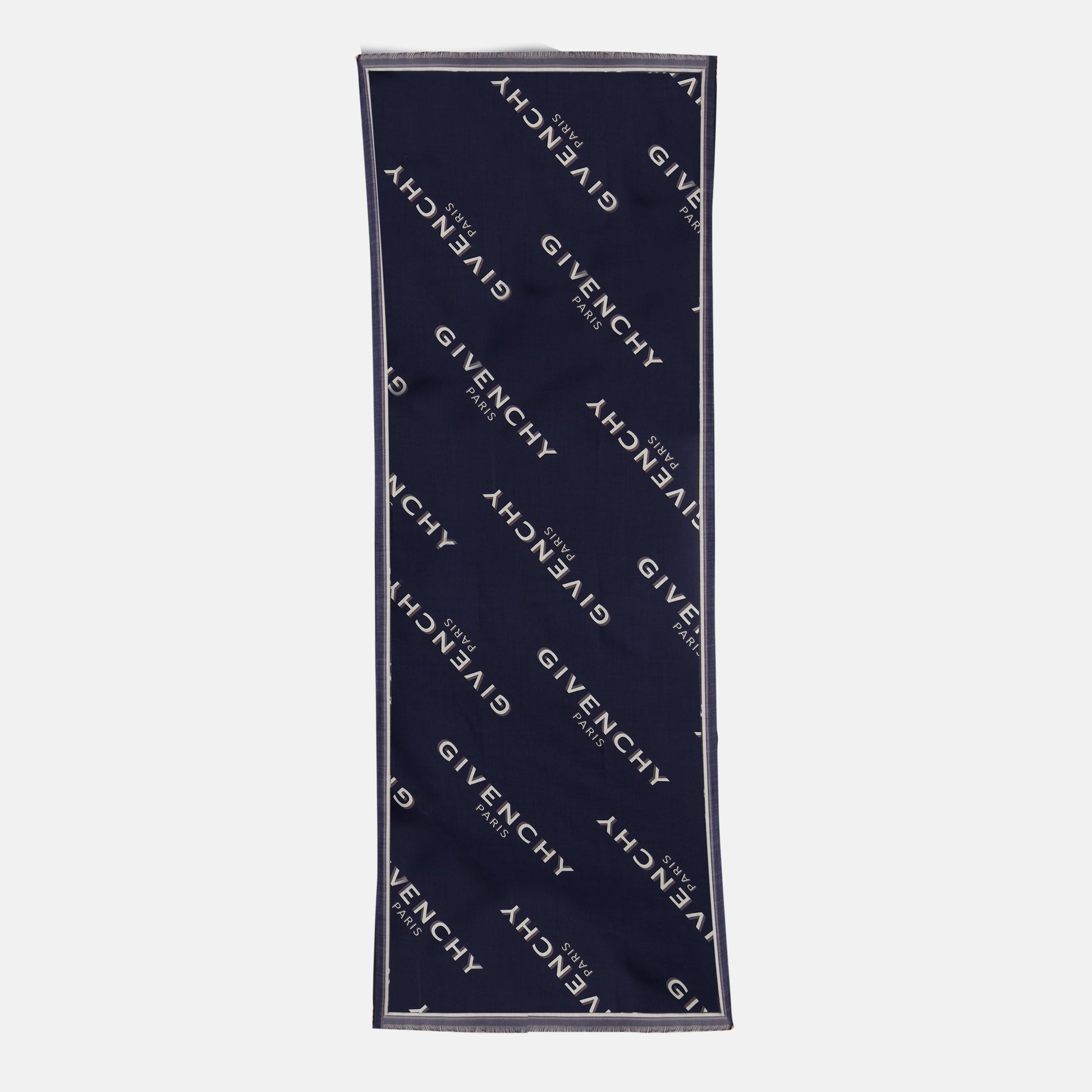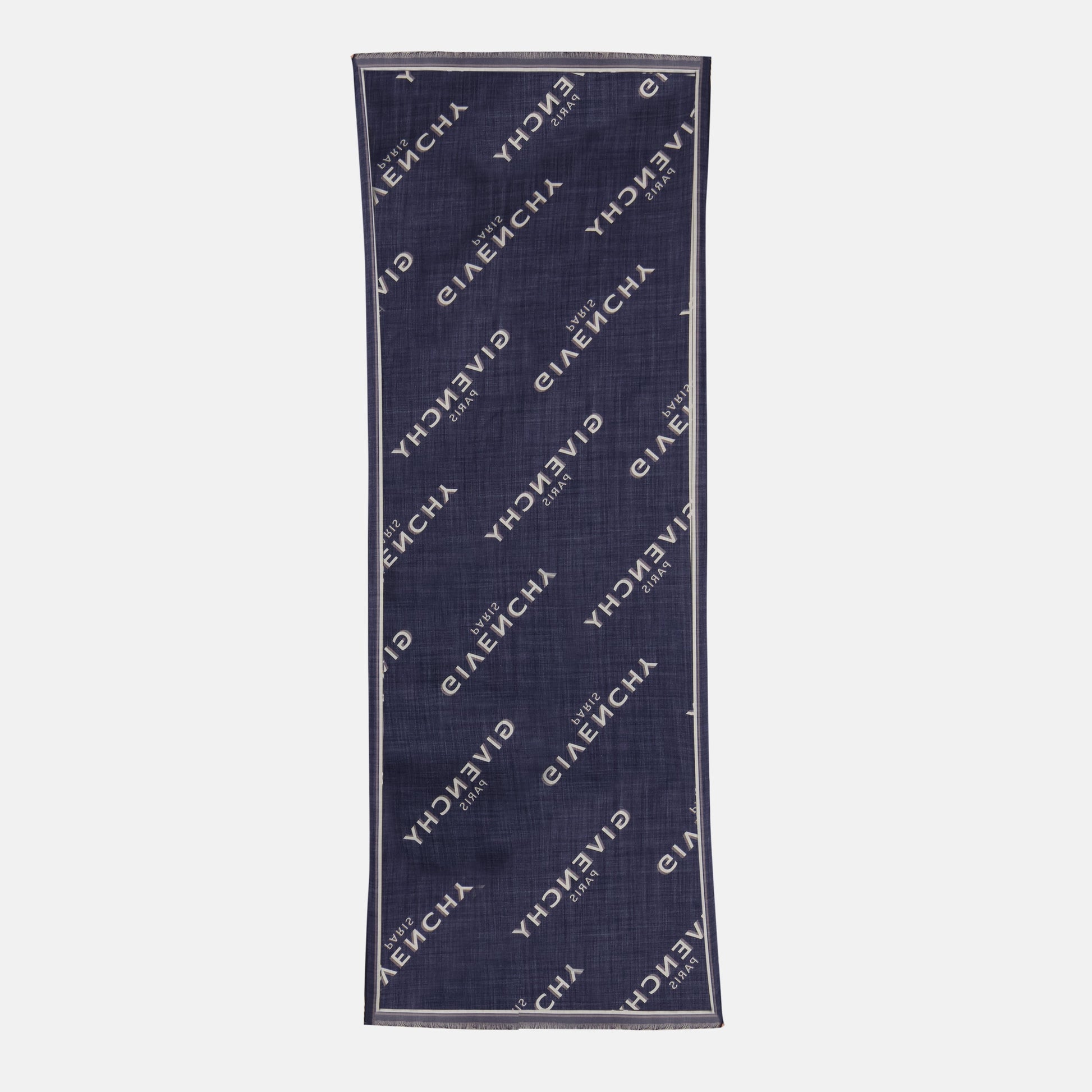 The Givenchy Shadow blue stole is a women's accessory from the Autumn-Winter 2025 collection. Made of wool and silk, it features fringed edges and a monogrammed logo.