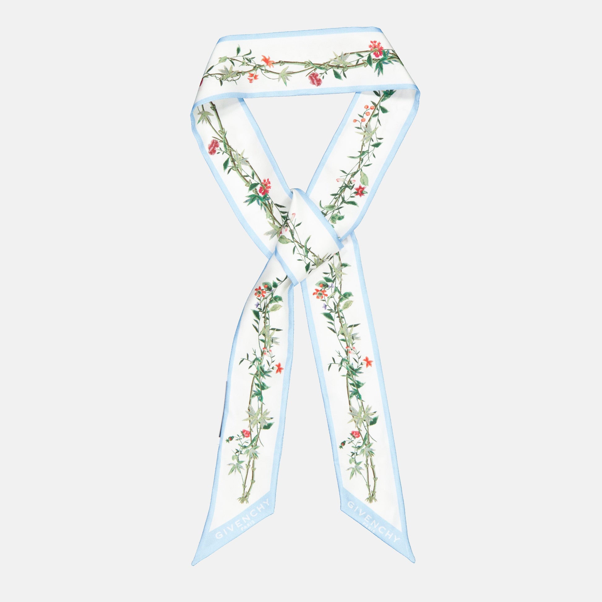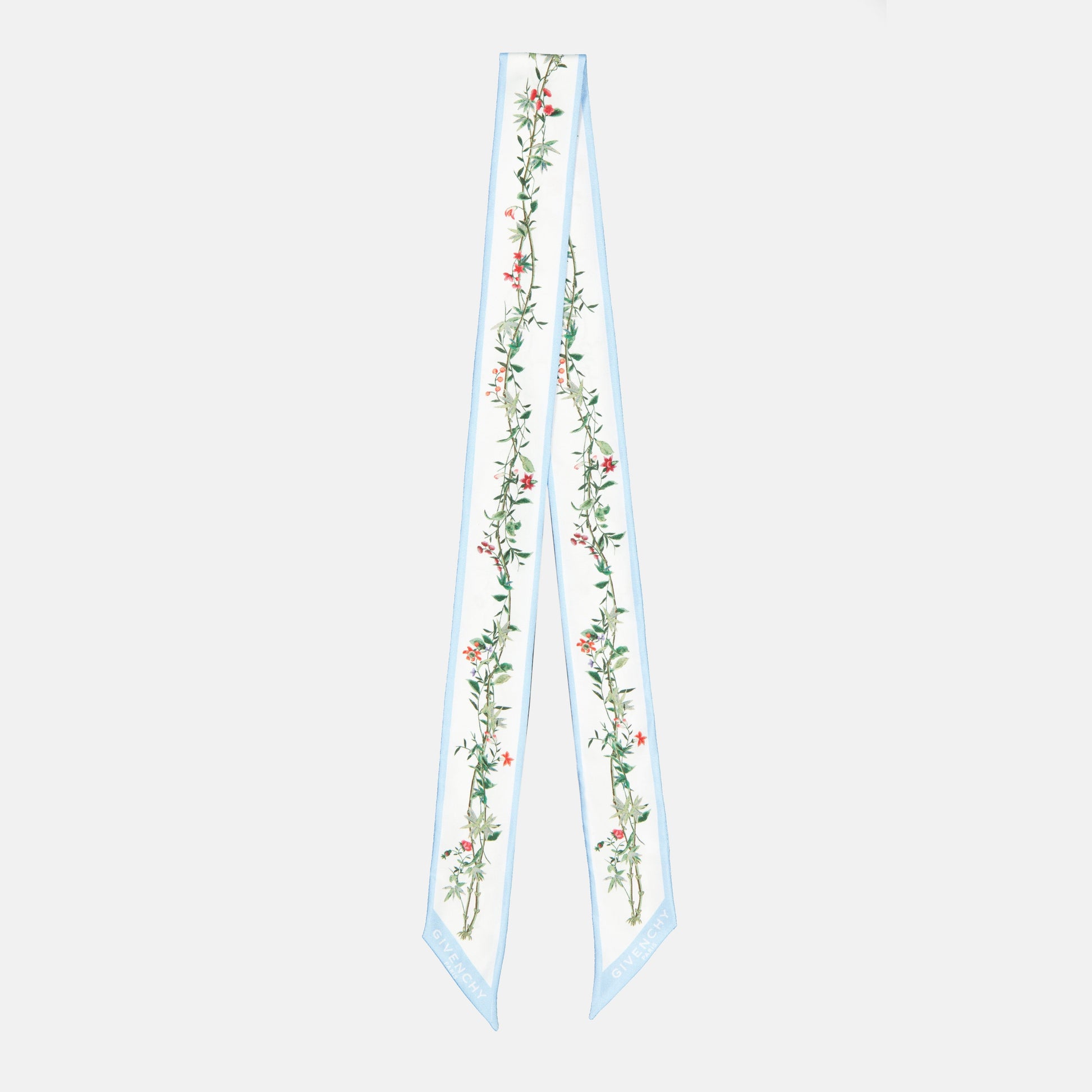 The silk flower headband from Givenchy is an elegant accessory for women. It is part of the Autumn-Winter 2025 collection, featuring a floral print and contrasting beveled edges.