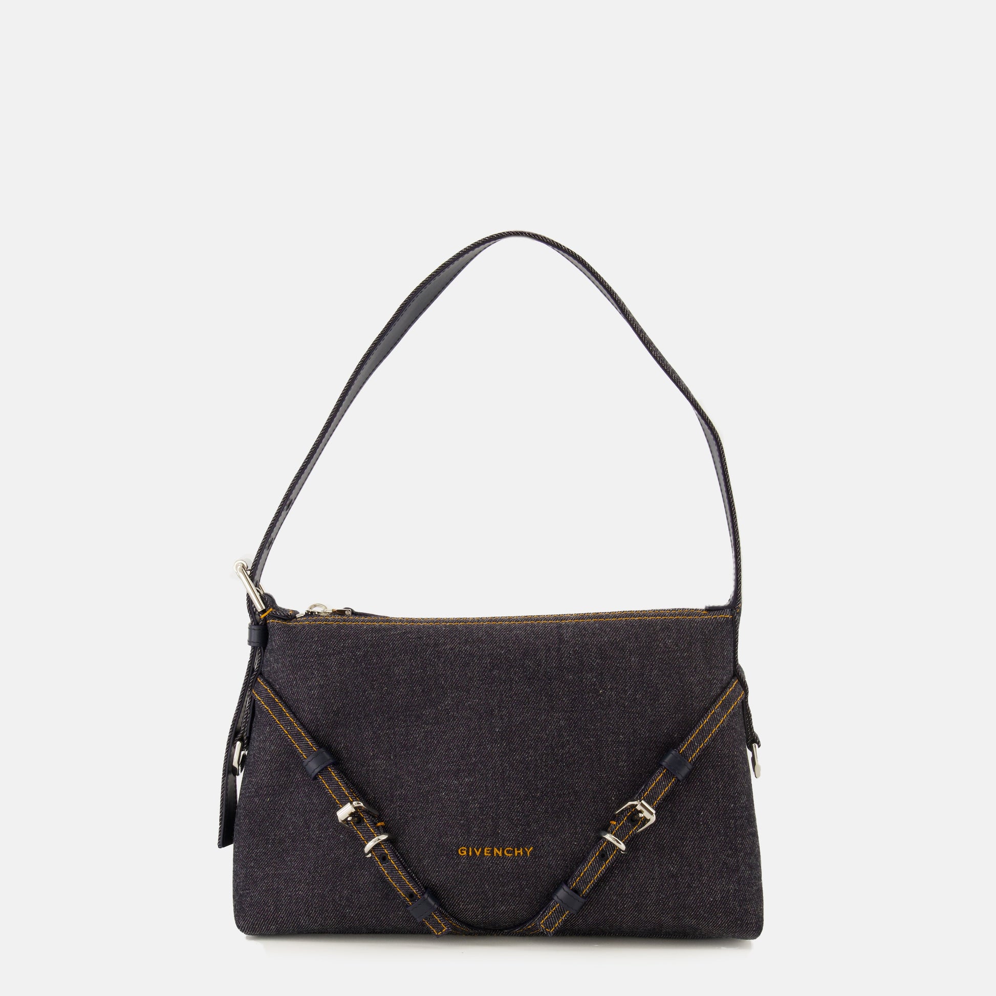 The Voyou mini bag in denim from Givenchy, designed for women, is an elegant accessory from the Autumn-Winter 2025 collection. It stands out with its blue-grey denim and golden metallic details.