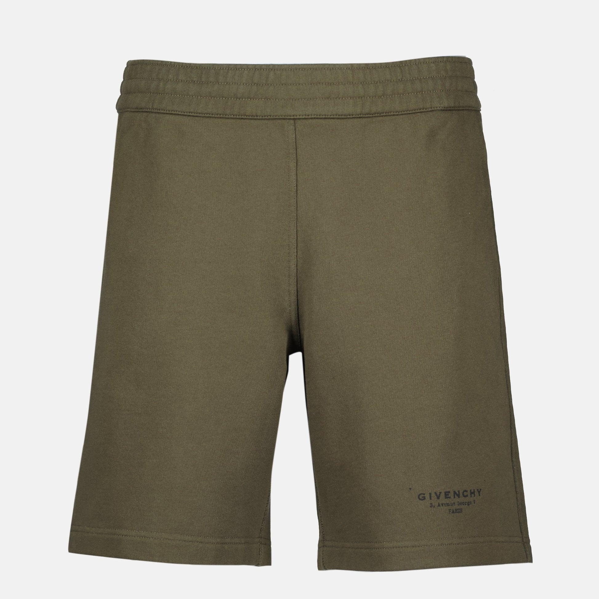 Kaki cotton shorts by Givenchy for men, part of the Autumn-Winter 2025 collection. This pull-on model features a printed logo and slanted side pockets.