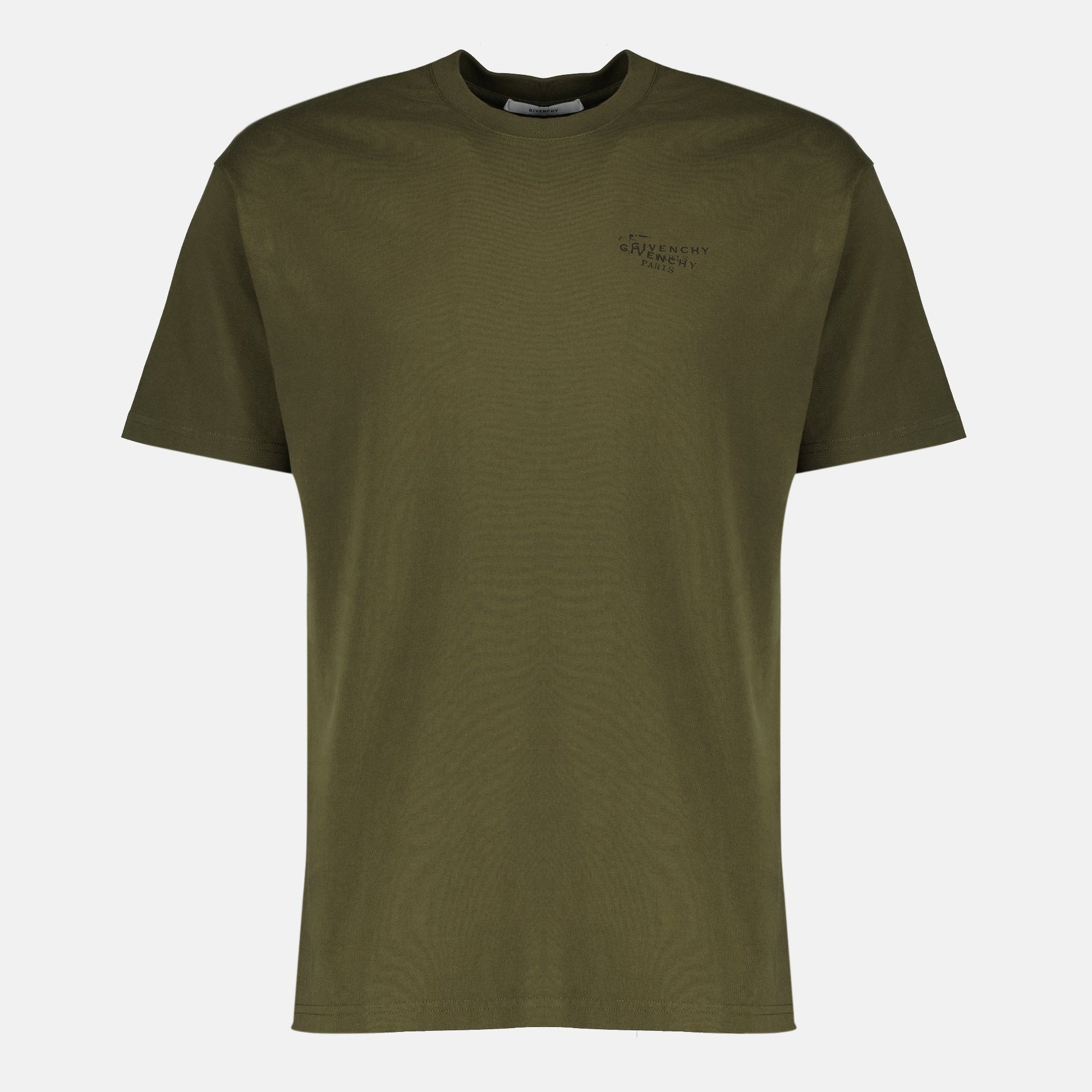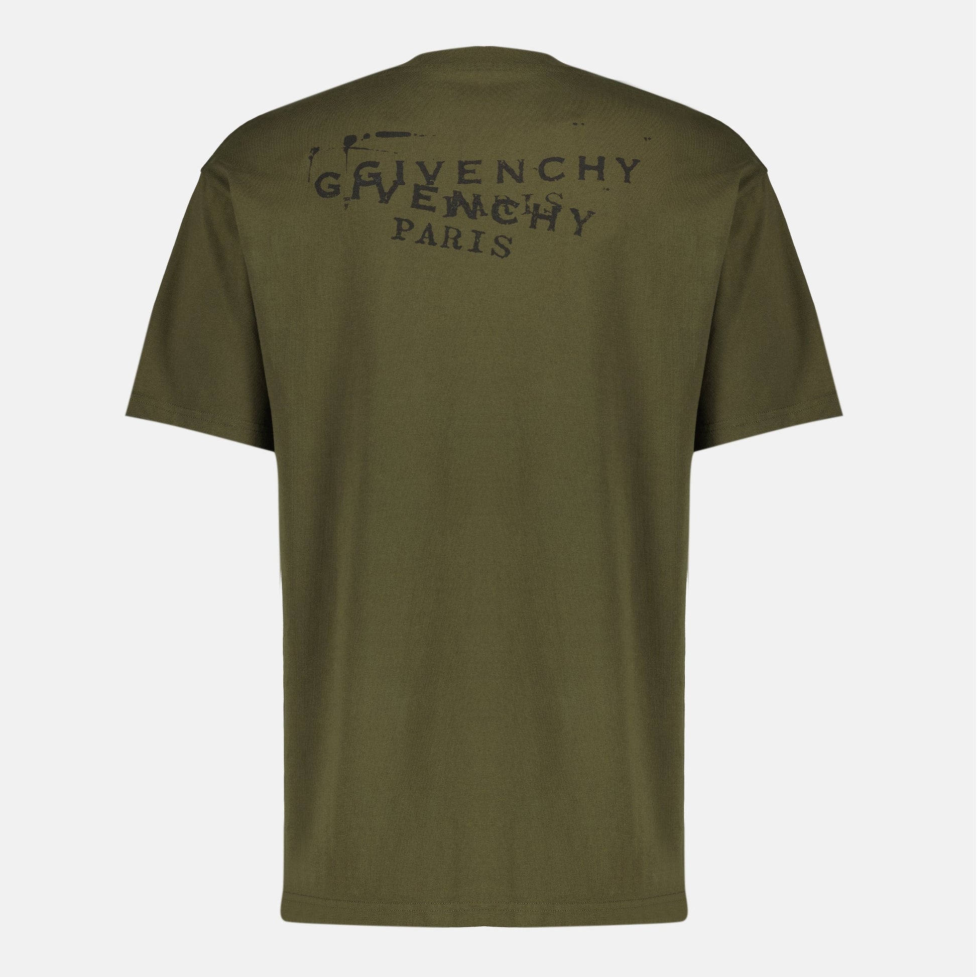 The Givenchy Stamp khaki T-shirt is a men's model from the Spring-Summer 2026 collection. It is made of cotton and features a printed logo.