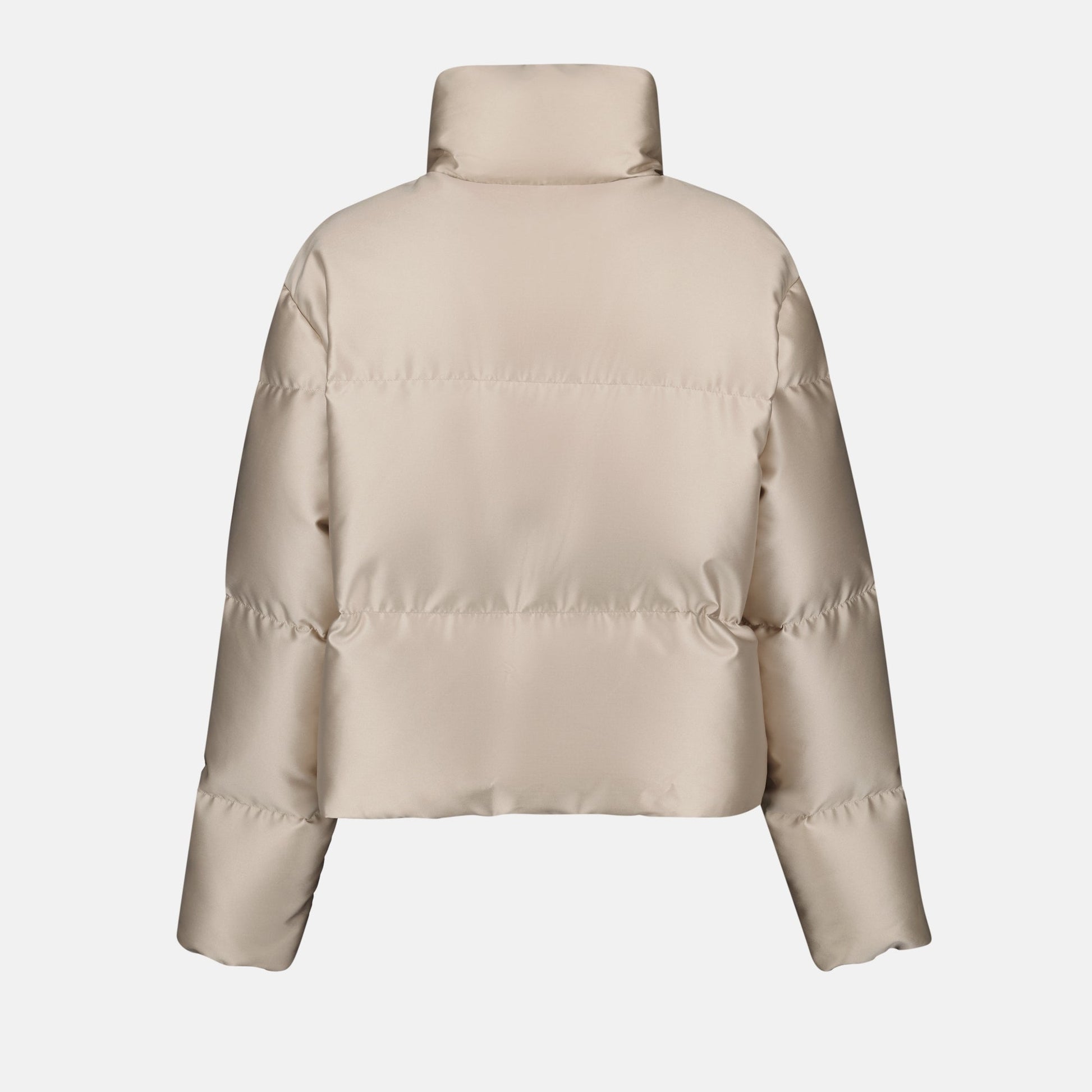 Bonnelles down jacket in shiny beige nylon from the brand Moncler, designed for women, is part of the Autumn-Winter 2024 collection. It features a high collar and gold metal details.